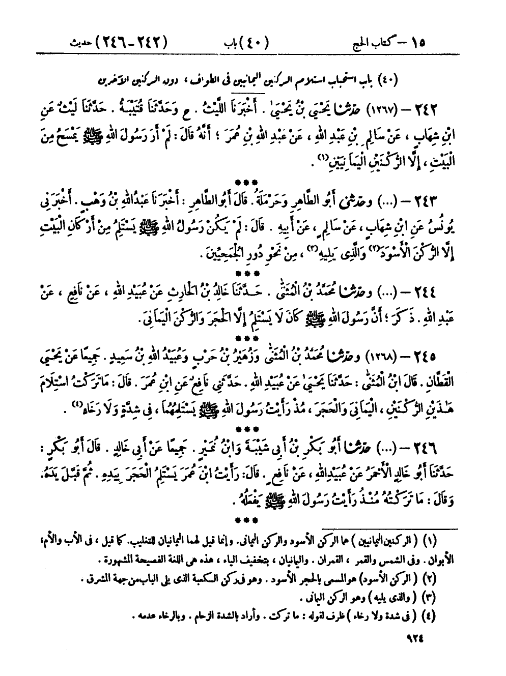 ٢٤٥ - (١٢٦٨) وحَدَّثَنَا مُحَمَّدُ بْنُ الْمُثَنَّى، وَزُهَيْرُ بْنُ حَرْبٍ، وَعُبَيْدُ اللهِ بْنُ سَعِيدٍ، جَمِيعًا عَنْ يَحْيَى الْقَطَّانِ، قَالَ ابْنُ الْمُثَنَّى: حَدَّثَنَا يَحْيَى، عَنْ عُبَيْدِ اللهِ، حَدَّثَنِي نَافِعٌ، عَنِ ابْنِ عُمَرَ، قَالَ: «مَا تَرَكْتُ اسْتِلَامَ هَذَيْنِ الرُّكْنَيْنِ الْيَمَانِيَ، وَالْحَجَرَ، مُذْ رَأَيْتُ رَسُولَ اللهِ صَلَّى اللهُ عَلَيْهِ وَسَلَّمَ يَسْتَلِمُهُمَا، فِي شِدَّةٍ وَلَا رَخَاءٍ»