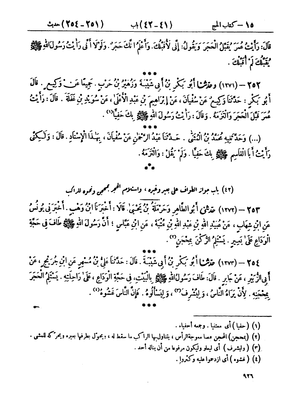 ٢٥٤ - (١٢٧٣) حَدَّثَنَا أَبُو بَكْرِ بْنُ أَبِي شَيْبَةَ، قَالَ: حَدَّثَنَا عَلِيُّ بْنُ مُسْهِرٍ، عَنِ ابْنِ جُرَيْجٍ، عَنْ أَبِي الزُّبَيْرِ، عَنْ جَابِرٍ، قَالَ: «طَافَ رَسُولُ اللهِ صَلَّى اللهُ عَلَيْهِ وَسَلَّمَ بِالْبَيْتِ فِي حَجَّةِ الْوَدَاعِ عَلَى رَاحِلَتِهِ يَسْتَلِمُ الْحَجَرَ بِمِحْجَنِهِ، لِأَنْ يَرَاهُ النَّاسُ وَلِيُشْرِفَ وَلِيَسْأَلُوهُ، فَإِنَّ النَّاسَ غَشُوهُ»