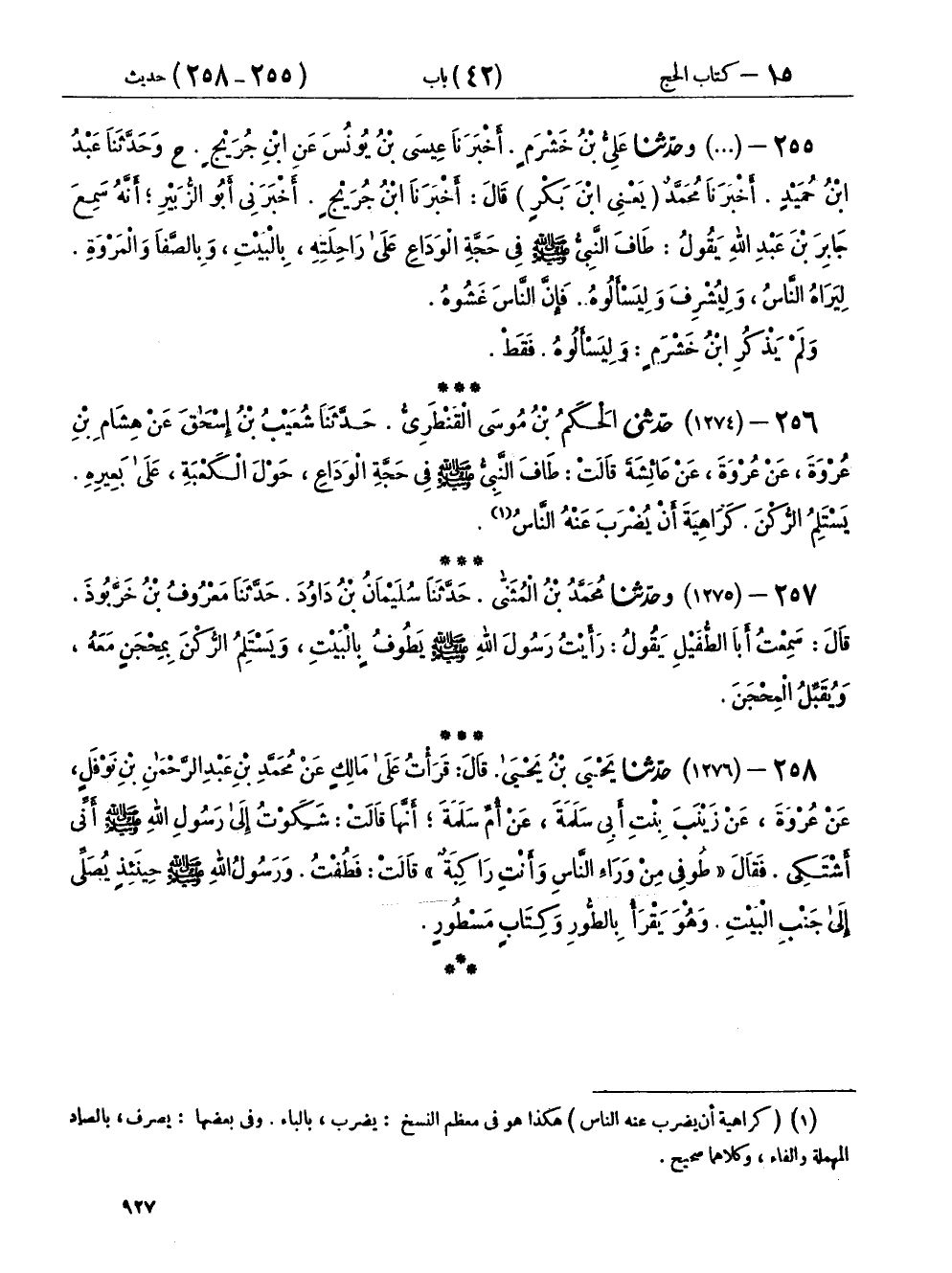 ٢٥٨ - (١٢٧٦) حَدَّثَنَا يَحْيَى بْنُ يَحْيَى، قَالَ: قَرَأْتُ عَلَى مَالِكٍ، عَنْ مُحَمَّدِ بْنِ عَبْدِ الرَّحْمَنِ بْنِ نَوْفَلٍ، عَنْ عُرْوَةَ، عَنْ زَيْنَبَ بِنْتِ أَبِي سَلَمَةَ، عَنْ أُمِّ سَلَمَةَ، أَنَّهَا قَالَتْ: شَكَوْتُ إِلَى رَسُولِ اللهِ صَلَّى اللهُ عَلَيْهِ وَسَلَّمَ أَنِّي أَشْتَكِي فَقَالَ: «طُوفِي مِنْ وَرَاءِ النَّاسِ وَأَنْتِ رَاكِبَةٌ» قَالَتْ: فَطُفْتُ، «وَرَسُولُ اللهِ صَلَّى اللهُ عَلَيْهِ وَسَلَّمَ حِينَئِذٍ يُصَلِّي إِلَى جَنْبِ الْبَيْتِ، وَهُوَ يَقْرَأُ بِالطُّورِ وَكِتَابٍ مَسْطُورٍ»