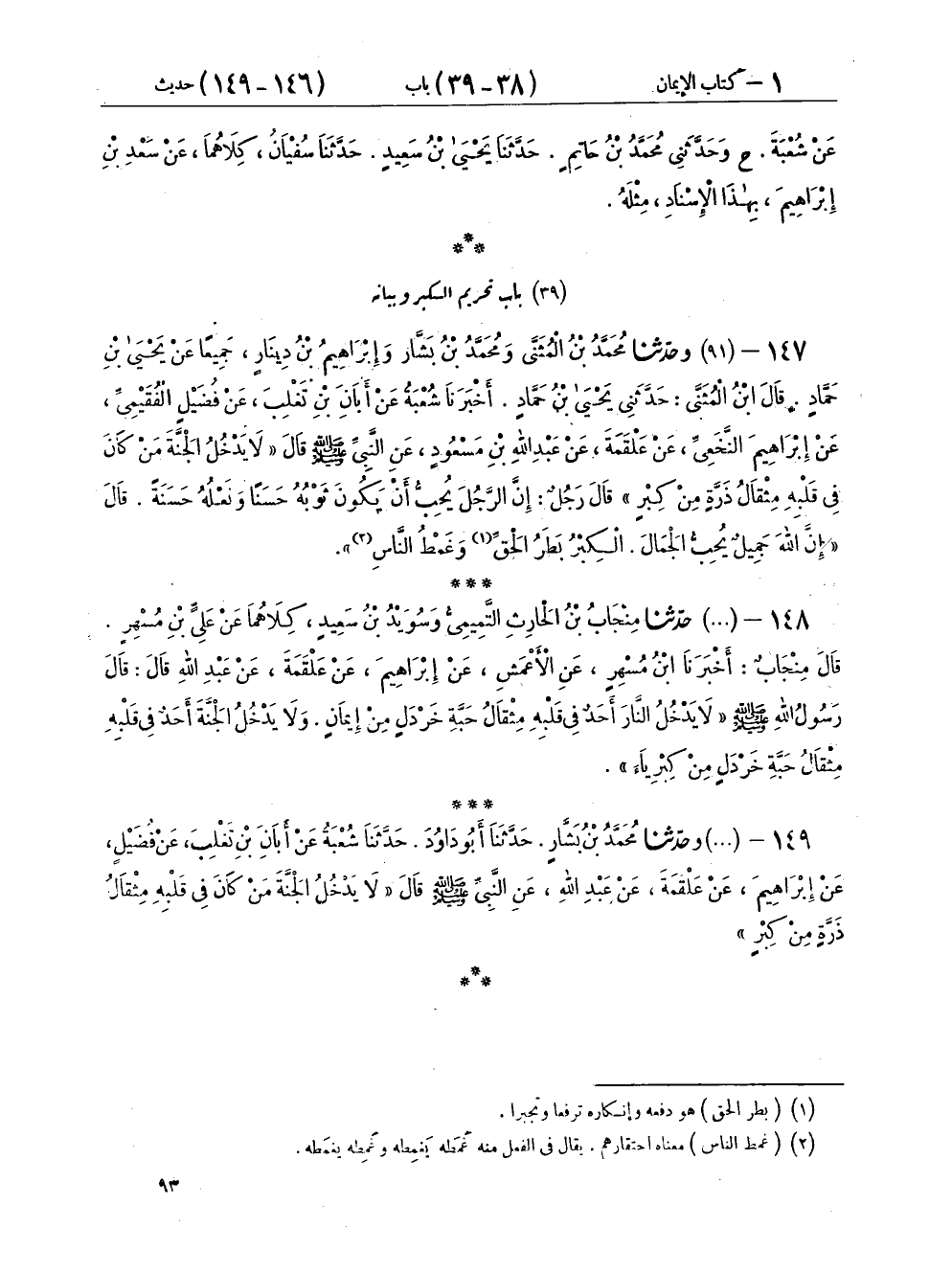 ١٤٧ - (٩١) وَحَدَّثَنَا مُحَمَّدُ بْنُ الْمُثَنَّى، وَمُحَمَّدُ بْنُ بَشَّارٍ، وَإِبْرَاهِيمُ بْنُ دِينَارٍ، جَمِيعًا عَنْ يَحْيَى بْنِ حَمَّادٍ، قَالَ ابْنُ الْمُثَنَّى: حَدَّثَنِي يَحْيَى بْنُ حَمَّادٍ، أَخْبَرَنَا شُعْبَةُ، عَنْ أَبَانَ بْنِ تَغْلِبَ، عَنْ فُضَيْلٍ الْفُقَيْمِيِّ، عَنْ إِبْرَاهِيمَ النَّخَعِيِّ، عَنْ عَلْقَمَةَ، عَنْ عَبْدِ اللهِ بْنِ مَسْعُودٍ، عَنِ النَّبِيِّ صَلَّى اللهُ عَلَيْهِ وَسَلَّمَ قَالَ: «لَا يَدْخُلُ الْجَنَّةَ مَنْ كَانَ فِي قَلْبِهِ مِثْقَالُ ذَرَّةٍ مِنْ كِبْرٍ» قَالَ رَجُلٌ: إِنَّ الرَّجُلَ يُحِبُّ أَنْ يَكُونَ ثَوْبُهُ حَسَنًا وَنَعْلُهُ حَسَنَةً، قَالَ: «إِنَّ اللهَ جَمِيلٌ يُحِبُّ الْجَمَالَ، الْكِبْرُ بَطَرُ الْحَقِّ، وَغَمْطُ النَّاسِ»
