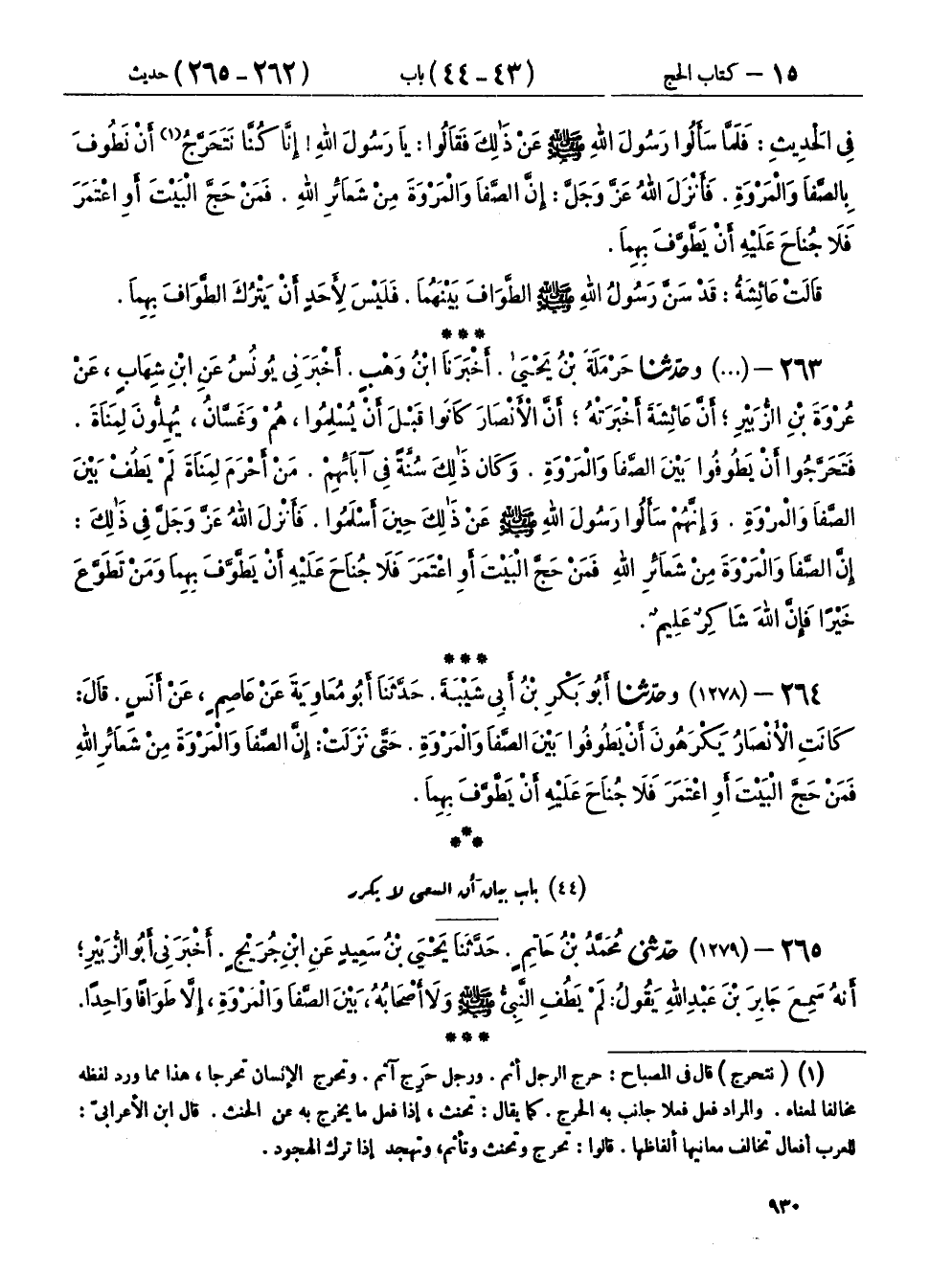 ٢٦٤ - (١٢٧٨) وحَدَّثَنَا أَبُو بَكْرِ بْنُ أَبِي شَيْبَةَ، حَدَّثَنَا أَبُو مُعَاوِيَةَ، عَنْ عَاصِمٍ، عَنْ أَنَسٍ، قَالَ: " كَانَتِ الْأَنْصَارُ يَكْرَهُونَ أَنْ يَطُوفُوا بَيْنَ الصَّفَا وَالْمَرْوَةِ، حَتَّى نَزَلَتْ: {إِنَّ الصَّفَا وَالْمَرْوَةَ مِنْ شَعَائِرِ} [البقرة: ١٥٨] اللهِ، فَمَنْ حَجَّ الْبَيْتَ أَوِ اعْتَمَرَ فَلَا جُنَاحَ عَلَيْهِ أَنْ يَطَّوَّفَ بِهِمَا "