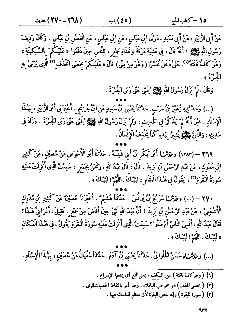 ٢٦٩ - (١٢٨٣) وحَدَّثَنَا أَبُو بَكْرِ بْنُ أَبِي شَيْبَةَ، حَدَّثَنَا أَبُو الْأَحْوَصِ، عَنْ حُصَيْنٍ، عَنْ كَثِيرِ بْنِ مُدْرِكٍ، عَنْ عَبْدِ الرَّحْمَنِ بْنِ يَزِيدَ، قَالَ: قَالَ عَبْدُ اللهِ، وَنَحْنُ بِجَمْعٍ سَمِعْتُ الَّذِي أُنْزِلَتْ عَلَيْهِ سُورَةُ الْبَقَرَةِ يَقُولُ فِي هَذَا الْمَقَامِ: «لَبَّيْكَ، اللهُمَّ لَبَّيْكَ»