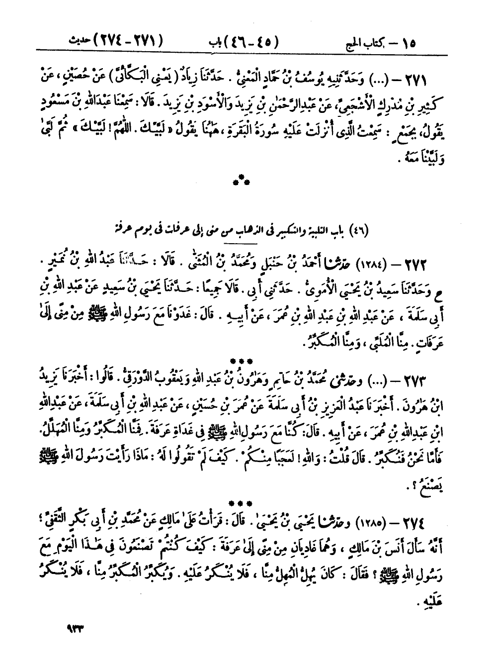 ٢٧٢ - (١٢٨٤) حَدَّثَنَا أَحْمَدُ بْنُ حَنْبَلٍ، وَمُحَمَّدُ بْنُ الْمُثَنَّى، قَالَا: حَدَّثَنَا عَبْدُ اللهِ بْنُ نُمَيْرٍ، ح وحَدَّثَنَا سَعِيدُ بْنُ يَحْيَى الْأُمَوِيُّ، حَدَّثَنِي أَبِي، قَالَا: جَمِيعًا حَدَّثَنَا يَحْيَى بْنُ سَعِيدٍ، عَنْ عَبْدِ اللهِ بْنِ أَبِي سَلَمَةَ، عَنْ عَبْدِ اللهِ بْنِ عَبْدِ اللهِ بْنِ عُمَرَ، عَنْ أَبِيهِ، قَالَ: «غَدَوْنَا مَعَ رَسُولِ اللهِ صَلَّى اللهُ عَلَيْهِ وَسَلَّمَ مِنْ مِنًى إِلَى عَرَفَاتٍ، مِنَّا الْمُلَبِّي وَمِنَّا الْمُكَبِّرُ»