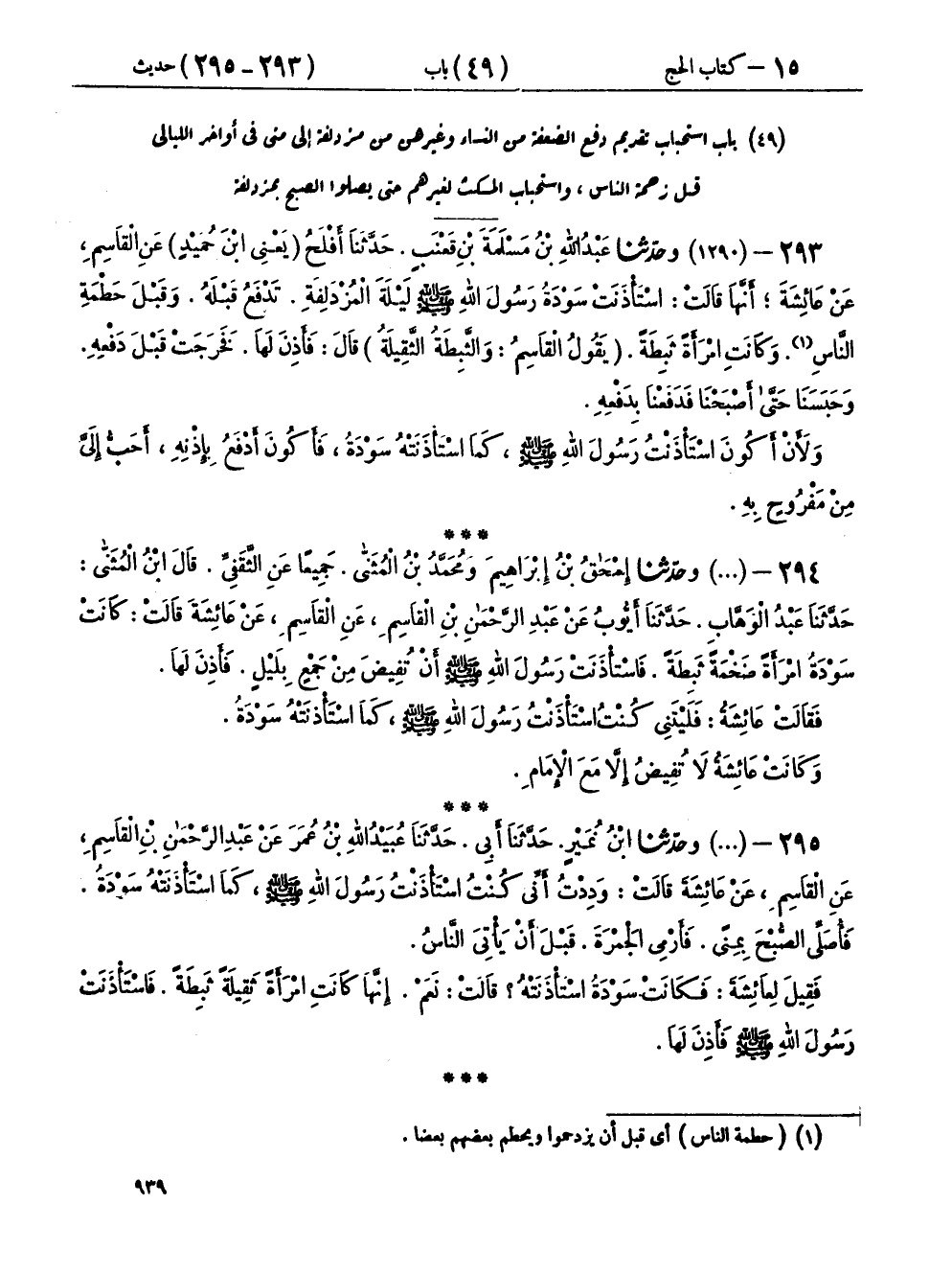٢٩٣ - (١٢٩٠) وحَدَّثَنَا عَبْدُ اللهِ بْنُ مَسْلَمَةَ بْنِ قَعْنَبٍ، حَدَّثَنَا أَفْلَحُ يَعْنِي ابْنَ حُمَيْدٍ، عَنِ الْقَاسِمِ، عَنْ عَائِشَةَ، أَنَّهَا قَالَتْ: " اسْتَأْذَنَتْ سَوْدَةُ رَسُولَ اللهِ صَلَّى اللهُ عَلَيْهِ وَسَلَّمَ لَيْلَةَ الْمُزْدَلِفَةِ، تَدْفَعُ قَبْلَهُ، وَقَبْلَ حَطْمَةِ النَّاسِ، وَكَانَتِ امْرَأَةً ثَبِطَةً - يَقُولُ الْقَاسِمُ: وَالثَّبِطَةُ الثَّقِيلَةُ - قَالَ: فَأَذِنَ لَهَا، فَخَرَجَتْ قَبْلَ دَفْعِهِ، وَحَبَسَنَا حَتَّى أَصْبَحْنَا فَدَفَعْنَا بِدَفْعِهِ " وَلَأَنْ أَكُونَ اسْتَأْذَنْتُ رَسُولَ اللهِ صَلَّى اللهُ عَلَيْهِ وَسَلَّمَ، كَمَا اسْتَأْذَنَتْهُ سَوْدَةُ، فَأَكُونَ أَدْفَعُ بِإِذْنِهِ، أَحَبُّ إِلَيَّ مِنْ مَفْرُوحٍ بِهِ