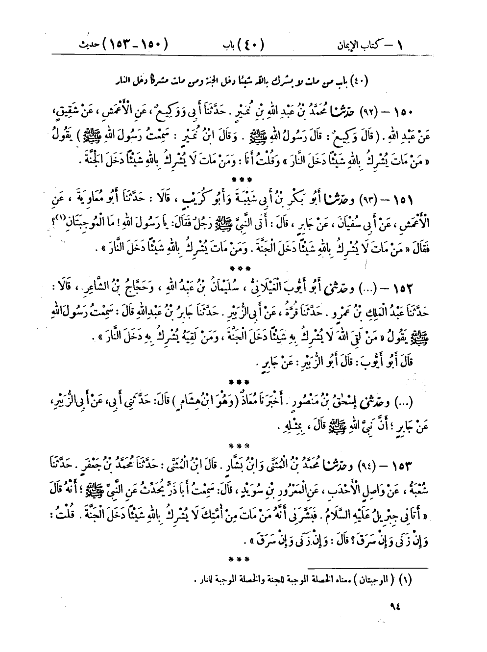 ١٥١ - (٩٣) وَحَدَّثَنَا أَبُو بَكْرِ بْنُ أَبِي شَيْبَةَ، وَأَبُو كُرَيْبٍ، قَالَا: حَدَّثَنَا أَبُو مُعَاوِيَةَ، عَنِ الْأَعْمَشِ، عَنْ أَبِي سُفْيَانَ، عَنْ جَابِرٍ، قَالَ: أَتَى النَّبِيَّ صَلَّى اللهُ عَلَيْهِ وَسَلَّمَ رَجُلٌ فَقَالَ: يَا رَسُولَ اللهِ، مَا الْمُوجِبَتَانِ؟ فَقَالَ: «مَنْ مَاتَ لَا يُشْرِكُ بِاللهِ شَيْئًا دَخَلَ الْجَنَّةَ، وَمَنْ مَاتَ يُشْرِكُ بِاللهِ شَيْئًا دَخَلَ النَّارَ»