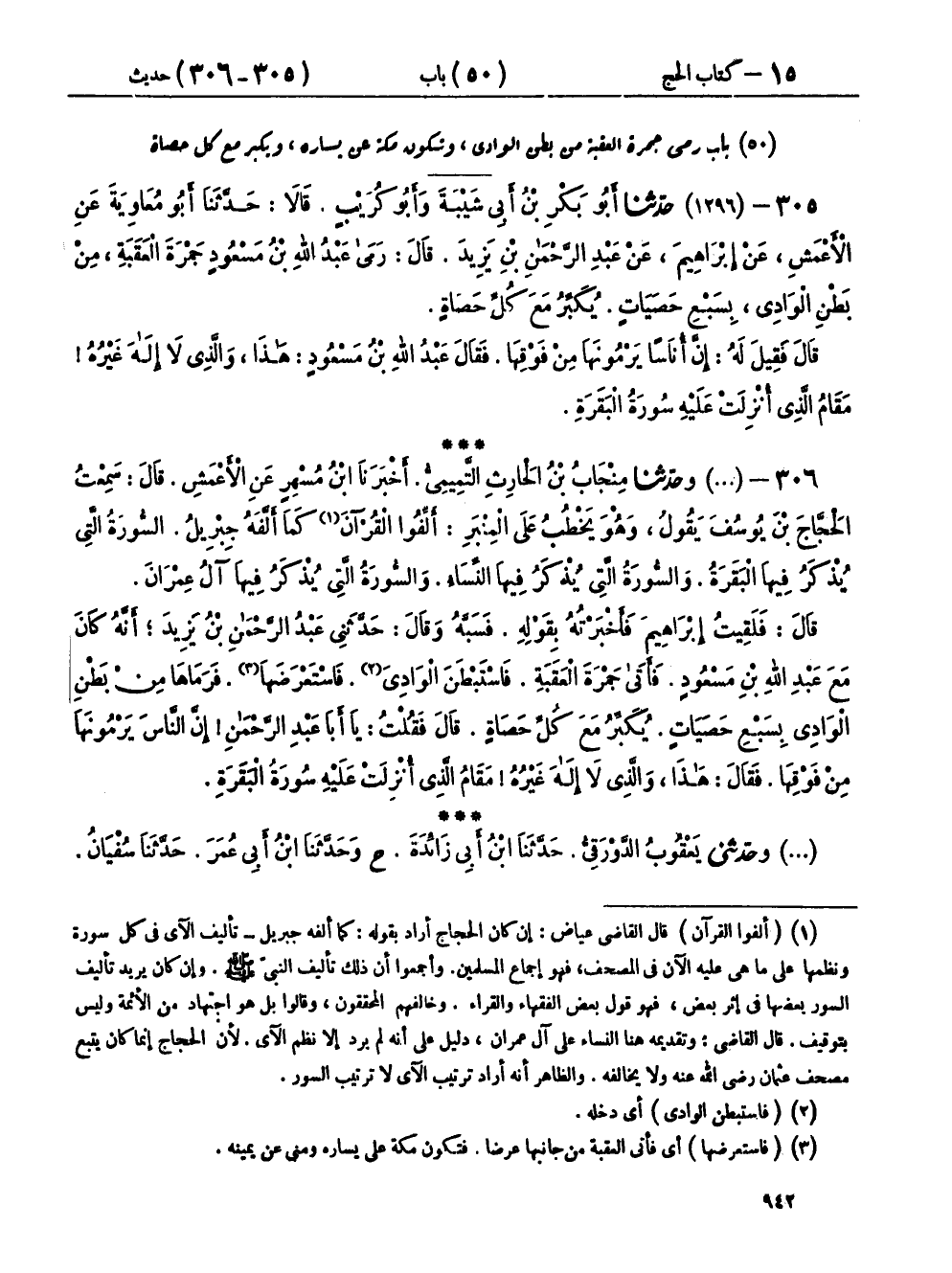 ٣٠٦ - (١٢٩٦) وحَدَّثَنَا مِنْجَابُ بْنُ الْحَارِثِ التَّمِيمِيُّ، أَخْبَرَنَا ابْنُ مُسْهِرٍ، عَنِ الْأَعْمَشِ، قَالَ: سَمِعْتُ الْحَجَّاجَ بْنَ يُوسُفَ، يَقُولُ: وَهُوَ يَخْطُبُ عَلَى الْمِنْبَرِ: أَلِّفُوا الْقُرْآنَ كَمَا أَلَّفَهُ جِبْرِيلُ، السُّورَةُ الَّتِي يُذْكَرُ فِيهَا الْبَقَرَةُ وَالسُّورَةُ الَّتِي يُذْكَرُ فِيهَا النِّسَاءُ، وَالسُّورَةُ الَّتِي يُذْكَرُ فِيهَا آلُ عِمْرَانَ. قَالَ: فَلَقِيتُ إِبْرَاهِيمَ فَأَخْبَرْتُهُ بِقَوْلِهِ، فَسَبَّهُ وَقَالَ: حَدَّثَنِي عَبْدُ الرَّحْمَنِ بْنُ يَزِيدَ، أَنَّهُ كَانَ مَعَ عَبْدِ اللهِ بْنِ مَسْعُودٍ، فَأَتَى جَمْرَةَ الْعَقَبَةِ، فَاسْتَبْطَنَ الْوَادِي، فَاسْتَعْرَضَهَا، فَرَمَاهَا مِنْ بَطْنِ الْوَادِي بِسَبْعِ حَصَيَاتٍ، يُكَبِّرُ مَعَ كُلِّ حَصَاةٍ، قَالَ فَقُلْتُ: يَا أَبَا عَبْدِ الرَّحْمَنِ إِنَّ النَّاسَ يَرْمُونَهَا مِنْ فَوْقِهَا فَقَالَ: هَذَا، وَالَّذِي لَا إِلَهَ غَيْرُهُ، «مَقَامُ الَّذِي أُنْزِلَتْ عَلَيْهِ سُورَةُ الْبَقَرَةِ»