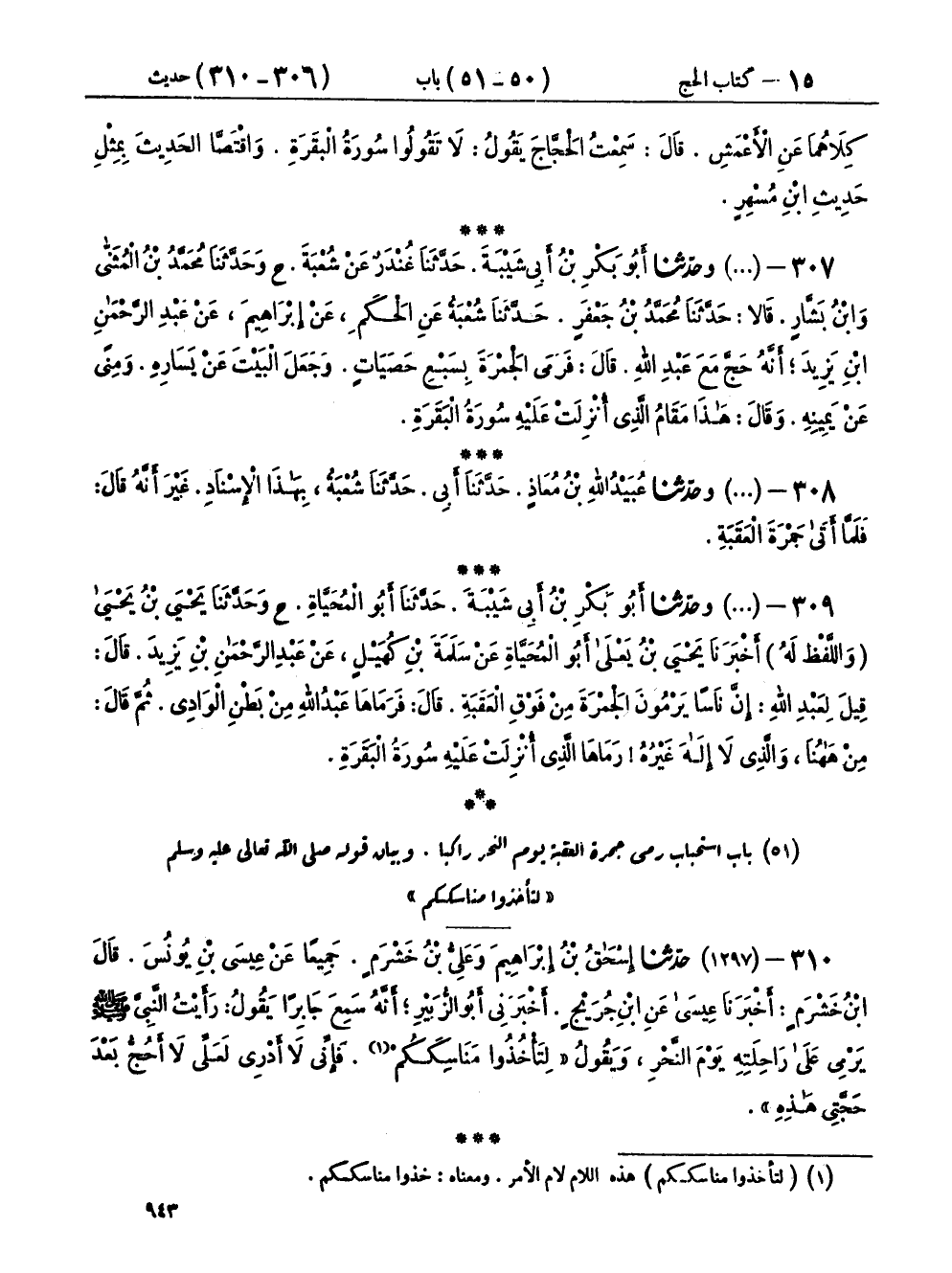 ٣٠٧ - (١٢٩٦) وحَدَّثَنَا أَبُو بَكْرِ بْنُ أَبِي شَيْبَةَ، حَدَّثَنَا غُنْدَرٌ، عَنْ شُعْبَةَ، ح وحَدَّثَنَا مُحَمَّدُ بْنُ الْمُثَنَّى، وَابْنُ بَشَّارٍ، قَالَا: حَدَّثَنَا مُحَمَّدُ بْنُ جَعْفَرٍ، حَدَّثَنَا شُعْبَةُ، عَنِ الْحَكَمِ، عَنْ إِبْرَاهِيمَ، عَنْ عَبْدِ الرَّحْمَنِ بْنِ يَزِيدَ، أَنَّهُ حَجَّ مَعَ عَبْدِ اللهِ قَالَ: فَرَمَى الْجَمْرَةَ بِسَبْعِ حَصَيَاتٍ وَجَعَلَ الْبَيْتَ عَنْ يَسَارِهِ وَمِنًى عَنْ يَمِينِهِ وَقَالَ: «هَذَا مَقَامُ الَّذِي أُنْزِلَتْ عَلَيْهِ سُورَةُ الْبَقَرَةِ»