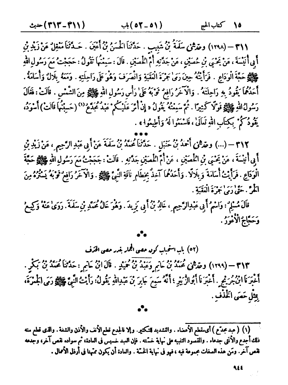 ٣١٢ - (١٢٩٨) وحَدَّثَنِي أَحْمَدُ بْنُ حَنْبَلٍ، حَدَّثَنَا مُحَمَّدُ بْنُ سَلَمَةَ، عَنْ أَبِي عَبْدِ الرَّحِيمِ، عَنْ زَيْدِ بْنِ أَبِي أُنَيْسَةَ، عَنْ يَحْيَى بْنِ الْحُصَيْنِ، عَنْ أُمِّ الْحُصَيْنِ، جَدَّتِهِ قَالَتْ: «حَجَجْتُ مَعَ رَسُولِ اللهِ صَلَّى اللهُ عَلَيْهِ وَسَلَّمَ حَجَّةَ الْوَدَاعِ، فَرَأَيْتُ أُسَامَةَ وَبِلَالًا، وَأَحَدُهُمَا آخِذٌ بِخِطَامِ نَاقَةِ النَّبِيِّ صَلَّى اللهُ عَلَيْهِ وَسَلَّمَ وَالْآخَرُ رَافِعٌ ثَوْبَهُ يَسْتُرُهُ مِنَ الْحَرِّ، حَتَّى رَمَى جَمْرَةَ الْعَقَبَةِ» قَالَ مُسْلِم: وَاسْمُ أَبِي عَبْدِ الرَّحِيمِ خَالِدُ بْنُ أَبِي يَزِيدَ وَهُوَ خَالُ مُحَمَّدِ بْنِ سَلَمَةَ رَوَى عَنْهُ وَكِيعٌ وَحَجَّاجٌ الْأَعْوَرُ