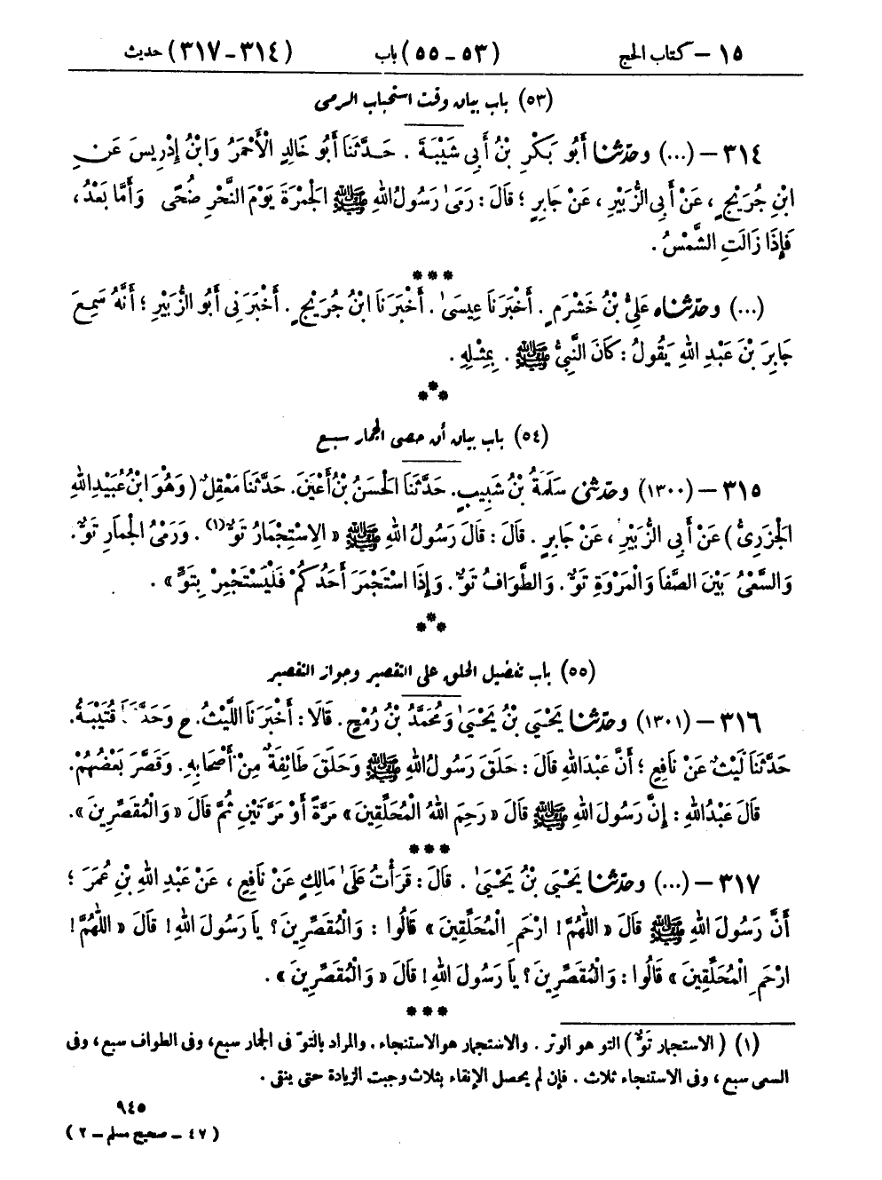 ٣١٦ - (١٣٠١) وحَدَّثَنَا يَحْيَى بْنُ يَحْيَى، وَمُحَمَّدُ بْنُ رُمْحٍ، قَالَا: أَخْبَرَنَا اللَّيْثُ، ح وحَدَّثَنَا قُتَيْبَةُ، حَدَّثَنَا لَيْثٌ، عَنْ نَافِعٍ، أَنَّ عَبْدَ اللهِ، قَالَ: حَلَقَ رَسُولُ اللهِ صَلَّى اللهُ عَلَيْهِ وَسَلَّمَ وَحَلَقَ طَائِفَةٌ مِنْ أَصْحَابِهِ، وَقَصَّرَ بَعْضُهُمْ، قَالَ عَبْدُ اللهِ: إِنَّ رَسُولَ اللهِ صَلَّى اللهُ عَلَيْهِ وَسَلَّمَ قَالَ: «رَحِمَ اللهُ الْمُحَلِّقِينَ» مَرَّةً أَوْ مَرَّتَيْنِ، ثُمَّ قَالَ: «وَالْمُقَصِّرِينَ»