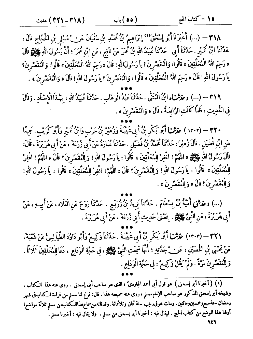 ٣١٨ - (١٣٠١) أَخْبَرَنَا أَبُو إِسْحَاقَ إِبْرَاهِيمُ بْنُ مُحَمَّدِ بْنِ سُفْيَانَ، عَنْ مُسْلِمِ بْنِ الْحَجَّاجِ قَالَ حَدَّثَنَا ابْنُ نُمَيْرٍ، حَدَّثَنَا أَبِي، حَدَّثَنَا عُبَيْدُ اللهِ بْنُ عُمَرَ، عَنْ نَافِعٍ، عَنِ ابْنِ عُمَرَ، أَنَّ رَسُولَ اللهِ صَلَّى اللهُ عَلَيْهِ وَسَلَّمَ، قَالَ: «رَحِمَ اللهُ الْمُحَلِّقِينَ» قَالُوا: وَالْمُقَصِّرِينَ؟ يَا رَسُولَ اللهِ، قَالَ: «رَحِمَ اللهُ الْمُحَلِّقِينَ» قَالُوا: وَالْمُقَصِّرِينَ؟ يَا رَسُولَ اللهِ، قَالَ: «رَحِمَ اللهُ الْمُحَلِّقِينَ» قَالُوا: وَالْمُقَصِّرِينَ؟ يَا رَسُولَ اللهِ، قَالَ: «وَالْمُقَصِّرِينَ»