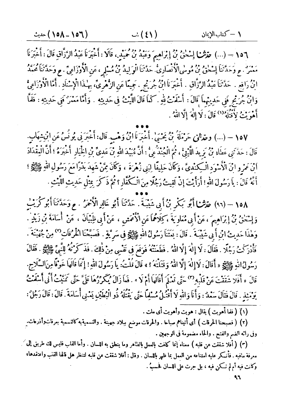 ١٥٦ - (٩٥) حَدَّثَنَا إِسْحَاقُ بْنُ إِبْرَاهِيمَ، وَعَبْدُ بْنُ حُمَيْدٍ قَالَا: أَخْبَرَنَا عَبْدُ الرَّزَّاقِ، قَالَ، أَخْبَرَنَا مَعْمَرٌ ح، وَحَدَّثَنَا إِسْحَاقُ بْنُ مُوسَى الْأَنْصَارِيُّ، حَدَّثَنَا الْوَلِيدُ بْنُ مُسْلِمٍ، عَنِ الْأَوْزَاعِيِّ ح، وَحَدَّثَنَا مُحَمَّدُ بْنُ رَافِعٍ، حَدَّثَنَا عَبْدُ الرَّزَّاقِ، أَخْبَرَنَا ابْنُ جُرَيْجٍ جَمِيعًا عَنِ الزُّهْرِيِّ بِهَذَا الْإِسْنَادِ. أَمَّا الْأَوْزَاعِيُّ، وَابْنُ جُرَيْجٍ فَفِي حَدِيثِهِمَا قَالَ: أَسْلَمْتُ لِلَّهِ كَمَا قَالَ اللَّيْثُ. وَأَمَّا مَعْمَرٌ فَفِي حَدِيثِهِ: فَلَمَّا أَهْوَيْتُ لِأَقْتُلَهُ قَالَ: لَا إِلَهَ إِلَّا اللهُ،