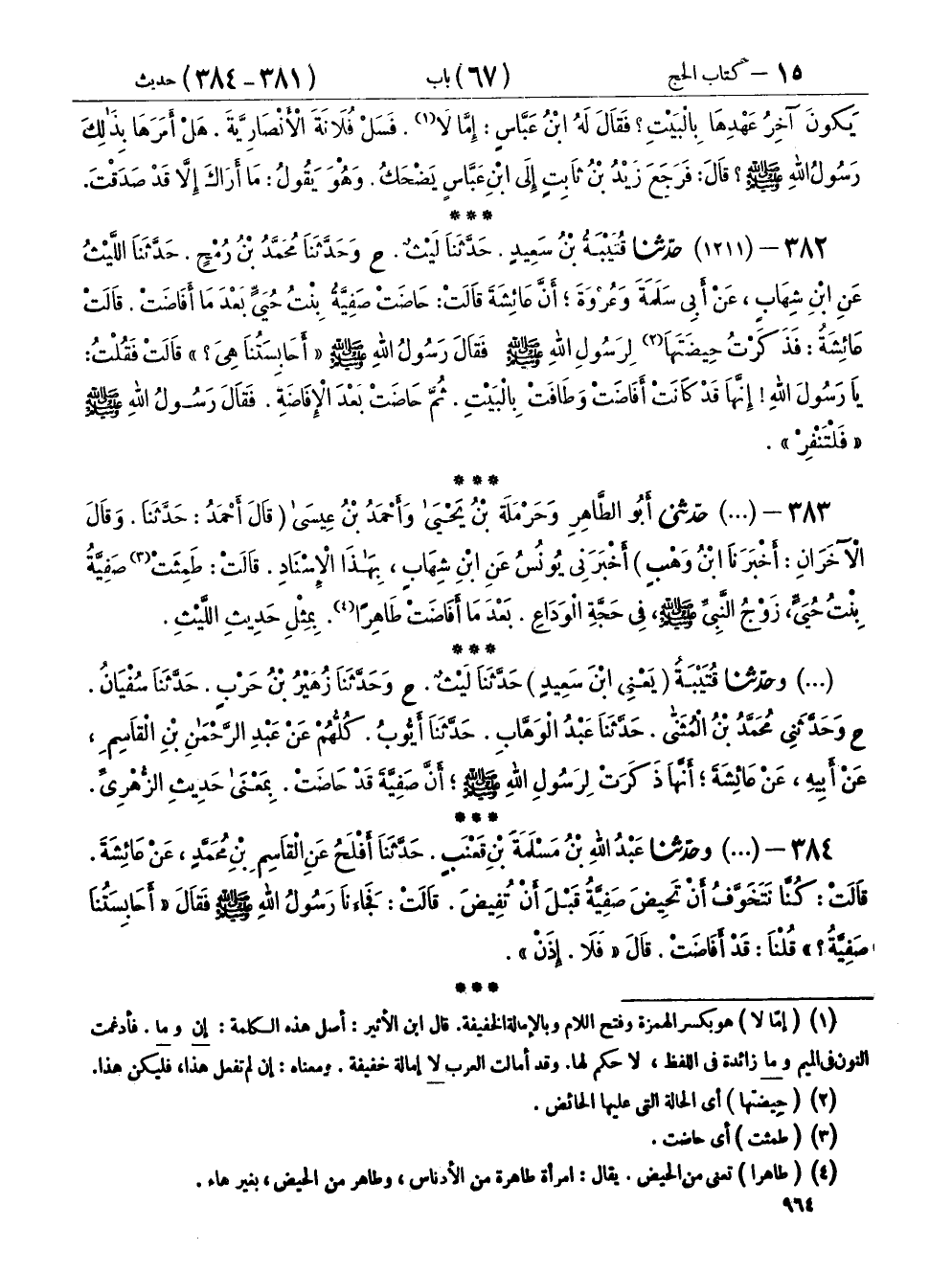 ٣٨٣ - (١٢١١) حَدَّثَنِي أَبُو الطَّاهِرِ، وَحَرْمَلَةُ بْنُ يَحْيَى، وَأَحْمَدُ بْنُ عِيسَى، قَالَ أَحْمَدُ: حَدَّثَنَا، وَقَالَ الْآخَرَانِ: أَخْبَرَنَا ابْنُ وَهْبٍ، أَخْبَرَنِي يُونُسُ، عَنِ ابْنِ شِهَابٍ، بِهَذَا الْإِسْنَادِ. قَالَتْ: طَمِثَتْ صَفِيَّةُ بِنْتُ حُيَيٍّ، زَوْجُ النَّبِيِّ صَلَّى اللهُ عَلَيْهِ وَسَلَّمَ، فِي حَجَّةِ الْوَدَاعِ بَعْدَمَا أَفَاضَتْ طَاهِرًا، بِمِثْلِ حَدِيثِ اللَّيْثِ،