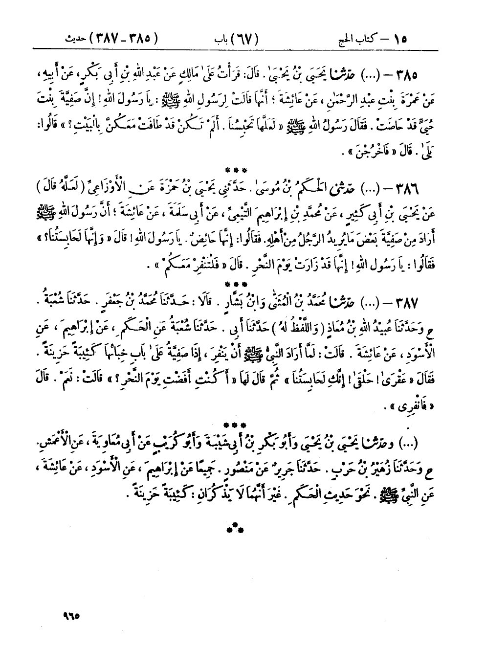 ٣٨٦ - (١٢١١) حَدَّثَنِي الْحَكَمُ بْنُ مُوسَى، حَدَّثَنِي يَحْيَى بْنُ حَمْزَةَ، عَنِ الْأَوْزَاعِيِّ، لَعَلَّهُ قَالَ: عَنْ يَحْيَى بْنِ أَبِي كَثِيرٍ، عَنْ مُحَمَّدِ بْنِ إِبْرَاهِيمَ التَّيْمِيِّ، عَنْ أَبِي سَلَمَةَ، عَنْ عَائِشَةَ، أَنَّ رَسُولَ اللهِ صَلَّى اللهُ عَلَيْهِ وَسَلَّمَ أَرَادَ مِنْ صَفِيَّةَ بَعْضَ مَا يُرِيدُ الرَّجُلُ مِنْ أَهْلِهِ، فَقَالُوا: إِنَّهَا حَائِضٌ، يَا رَسُولَ اللهِ، قَالَ: «وَإِنَّهَا لَحَابِسَتُنَا؟» فَقَالُوا: يَا رَسُولَ اللهِ، إِنَّهَا قَدْ زَارَتْ يَوْمَ النَّحْرِ، قَالَ: «فَلْتَنْفِرْ مَعَكُمْ»