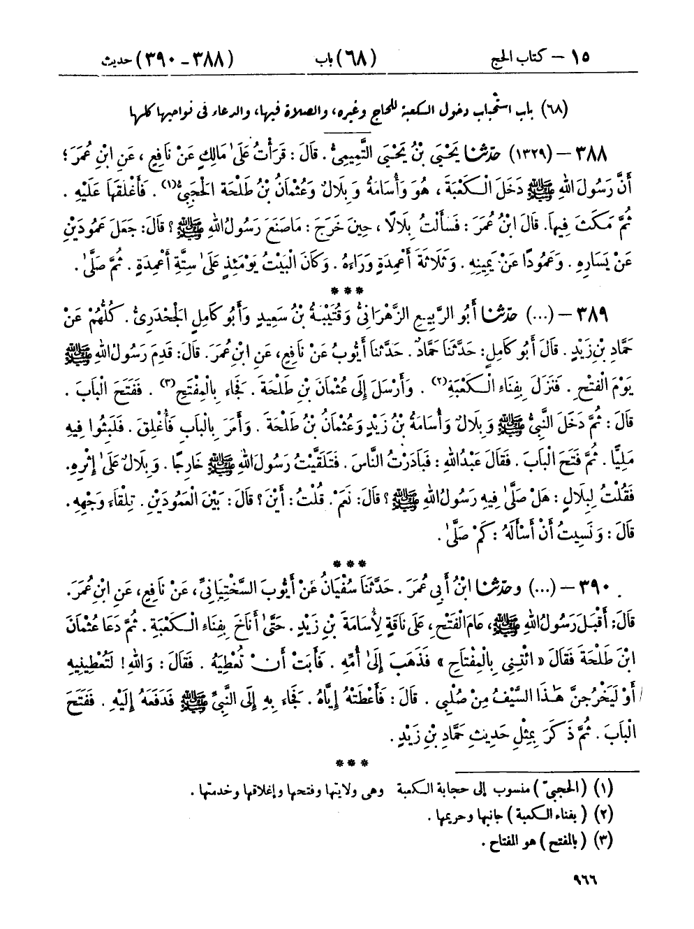 ٣٨٩ - (١٣٢٩) حَدَّثَنَا أَبُو الرَّبِيعِ الزَّهْرَانِيُّ، وَقُتَيْبَةُ بْنُ سَعِيدٍ، وَأَبُو كَامِلٍ الْجَحْدَرِيُّ، كُلُّهُمْ عَنْ حَمَّادِ بْنِ زَيْدٍ، قَالَ أَبُو كَامِلٍ: حَدَّثَنَا حَمَّادٌ، حَدَّثَنَا أَيُّوبُ، عَنْ نَافِعٍ، عَنِ ابْنِ عُمَرَ، قَالَ: قَدِمَ رَسُولُ اللهِ صَلَّى اللهُ عَلَيْهِ وَسَلَّمَ يَوْمَ الْفَتْحِ، فَنَزَلَ بِفِنَاءِ الْكَعْبَةِ، وَأَرْسَلَ إِلَى عُثْمَانَ بْنِ طَلْحَةَ، فَجَاءَ بِالْمِفْتَحِ، فَفَتَحَ الْبَابَ، قَالَ: ثُمَّ دَخَلَ النَّبِيُّ صَلَّى اللهُ عَلَيْهِ وَسَلَّمَ وَبِلَالٌ، وَأُسَامَةُ بْنُ زَيْدٍ، وَعُثْمَانُ بْنُ طَلْحَةَ، وَأَمَرَ بِالْبَابِ فَأُغْلِقَ، فَلَبِثُوا فِيهِ مَلِيًّا، ثُمَّ فَتَحَ الْبَابَ، فَقَالَ عَبْدُ اللهِ: فَبَادَرْتُ النَّاسَ فَتَلَقَّيْتُ رَسُولَ اللهِ صَلَّى اللهُ عَلَيْهِ وَسَلَّمَ خَارِجًا وَبِلَالٌ عَلَى إِثْرِهِ، فَقُلْتُ لِبِلَالٍ: «هَلْ صَلَّى فِيهِ رَسُولُ اللهِ صَلَّى اللهُ عَلَيْهِ وَسَلَّمَ؟» قَالَ: «نَعَمْ»، قُلْتُ: «أَيْنَ؟» قَالَ: «بَيْنَ الْعَمُودَيْنِ تِلْقَاءَ وَجْهِهِ»، قَالَ: " وَنَسِيتُ أَنْ أَسْأَلَهُ: كَمْ صَلَّى؟ ".