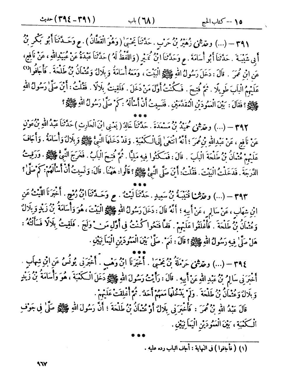 ٣٩٤ - (١٣٢٩) وحَدَّثَنِي حَرْمَلَةُ بْنُ يَحْيَى، أَخْبَرَنَا ابْنُ وَهْبٍ، أَخْبَرَنِي يُونُسُ، عَنِ ابْنِ شِهَابٍ، أَخْبَرَنِي سَالِمُ بْنُ عَبْدِ اللهِ، عَنْ أَبِيهِ، قَالَ: «رَأَيْتُ رَسُولَ اللهِ صَلَّى اللهُ عَلَيْهِ وَسَلَّمَ دَخَلَ الْكَعْبَةَ، هُوَ وَأُسَامَةُ بْنُ زَيْدٍ، وَبِلَالٌ، وَعُثْمَانُ بْنُ طَلْحَةَ، وَلَمْ يَدْخُلْهَا مَعَهُمْ أَحَدٌ، ثُمَّ أُغْلِقَتْ عَلَيْهِمْ»
