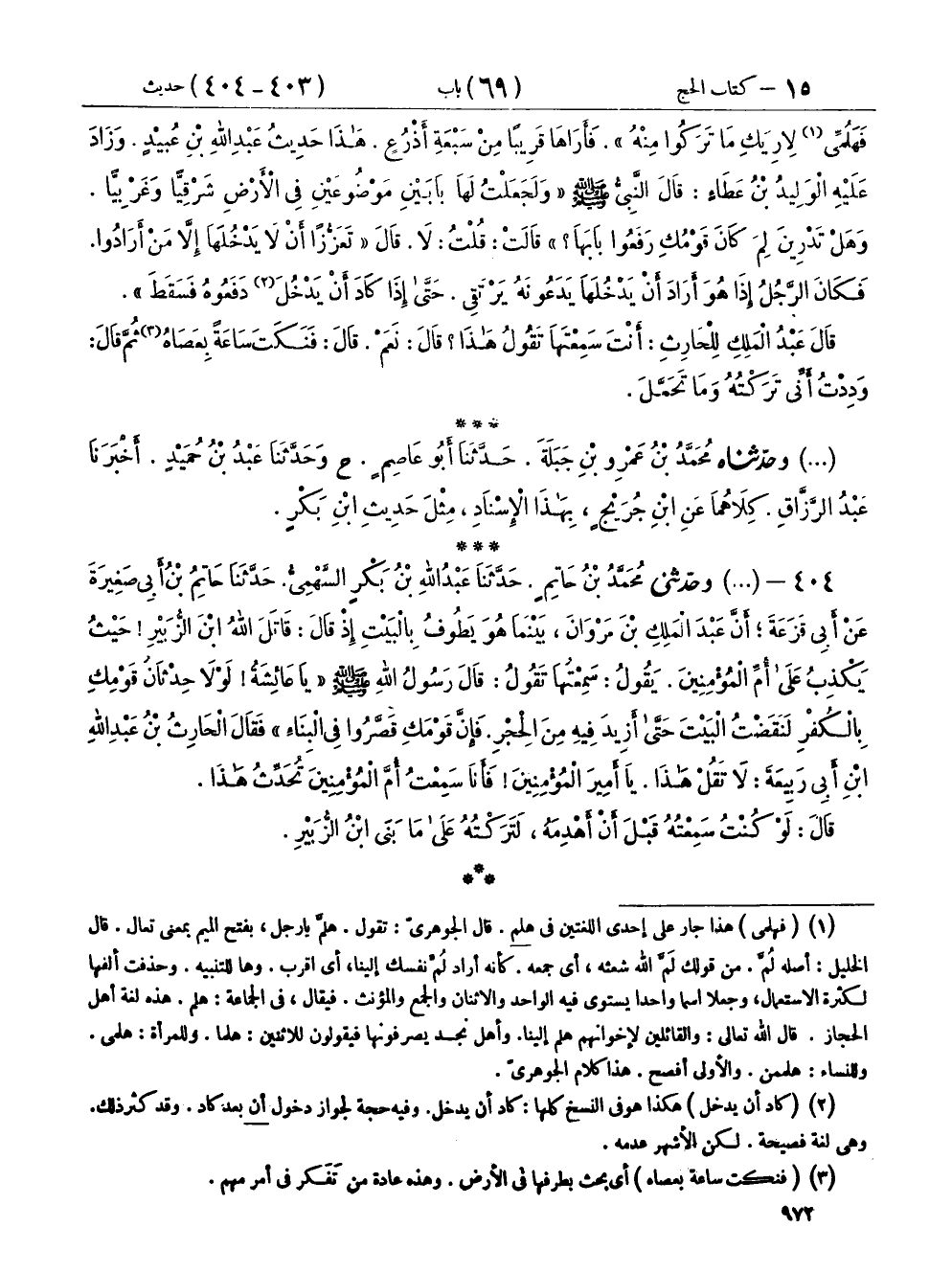 ٤٠٤ - (١٣٣٣) وحَدَّثَنِي مُحَمَّدُ بْنُ حَاتِمٍ، حَدَّثَنَا عَبْدُ اللهِ بْنُ بَكْرٍ السَّهْمِيُّ، حَدَّثَنَا حَاتِمُ بْنُ أَبِي صَغِيرَةَ، عَنْ أَبِي قَزَعَةَ، أَنَّ عَبْدَ الْمَلِكِ بْنَ مَرْوَانَ بَيْنَمَا هُوَ يَطُوفُ بِالْبَيْتِ إِذْ قَالَ: قَاتَلَ اللهُ ابْنَ الزُّبَيْرِ حَيْثُ يَكْذِبُ عَلَى أُمِّ الْمُؤْمِنِينَ، يَقُولُ: سَمِعْتُهَا تَقُولُ: قَالَ رَسُولُ اللهِ صَلَّى اللهُ عَلَيْهِ وَسَلَّمَ «يَا عَائِشَةُ لَوْلَا حِدْثَانُ قَوْمِكِ بِالْكُفْرِ لَنَقَضْتُ الْبَيْتَ حَتَّى أَزِيدَ فِيهِ مِنَ الْحِجْرِ، فَإِنَّ قَوْمَكِ قَصَّرُوا فِي الْبِنَاءِ»، فَقَالَ الْحَارِثُ بْنُ عَبْدِ اللهِ بْنِ أَبِي رَبِيعَةَ: لَا تَقُلْ هَذَا يَا أَمِيرَ الْمُؤْمِنِينَ، فَأَنَا سَمِعْتُ أُمَّ الْمُؤْمِنِينَ تُحَدِّثُ هَذَا قَالَ: لَوْ كُنْتُ سَمِعْتُهُ قَبْلَ أَنْ أَهْدِمَهُ، لَتَرَكْتُهُ عَلَى مَا بَنَى ابْنُ الزُّبَيْرِ