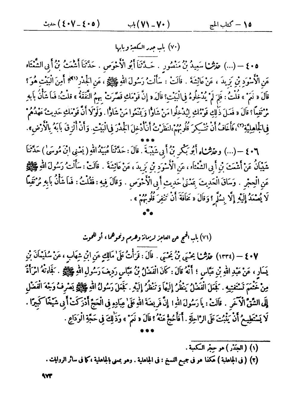 ٤٠٥ - (١٣٣٣) حَدَّثَنَا سَعِيدُ بْنُ مَنْصُورٍ، حَدَّثَنَا أَبُو الْأَحْوَصِ، حَدَّثَنَا أَشْعَثُ بْنُ أَبِي الشَّعْثَاءِ، عَنِ الْأَسْوَدِ بْنِ يَزِيدَ، عَنْ عَائِشَةَ، قَالَتْ: سَأَلْتُ رَسُولَ اللهِ صَلَّى اللهُ عَلَيْهِ وَسَلَّمَ عَنِ الْجَدْرِ أَمِنَ الْبَيْتِ هُوَ؟ قَالَ: «نَعَمْ»، قُلْتُ: فَلِمَ لَمْ يُدْخِلُوهُ فِي الْبَيْتِ؟ قَالَ: «إِنَّ قَوْمَكِ قَصَّرَتْ بِهِمِ النَّفَقَةُ»، قُلْتُ: فَمَا شَأْنُ بَابِهِ مُرْتَفِعًا؟ قَالَ: «فَعَلَ ذَلِكِ قَوْمُكِ لِيُدْخِلُوا مَنْ شَاءُوا، وَيَمْنَعُوا مَنْ شَاءُوا، وَلَوْلَا أَنَّ قَوْمَكِ حَدِيثٌ عَهْدُهُمْ فِي الْجَاهِلِيَّةِ، فَأَخَافُ أَنْ تُنْكِرَ قُلُوبُهُمْ، لَنَظَرْتُ أَنْ أُدْخِلَ الْجَدْرَ فِي الْبَيْتِ، وَأَنْ أُلْزِقَ بَابَهُ بِالْأَرْضِ»،