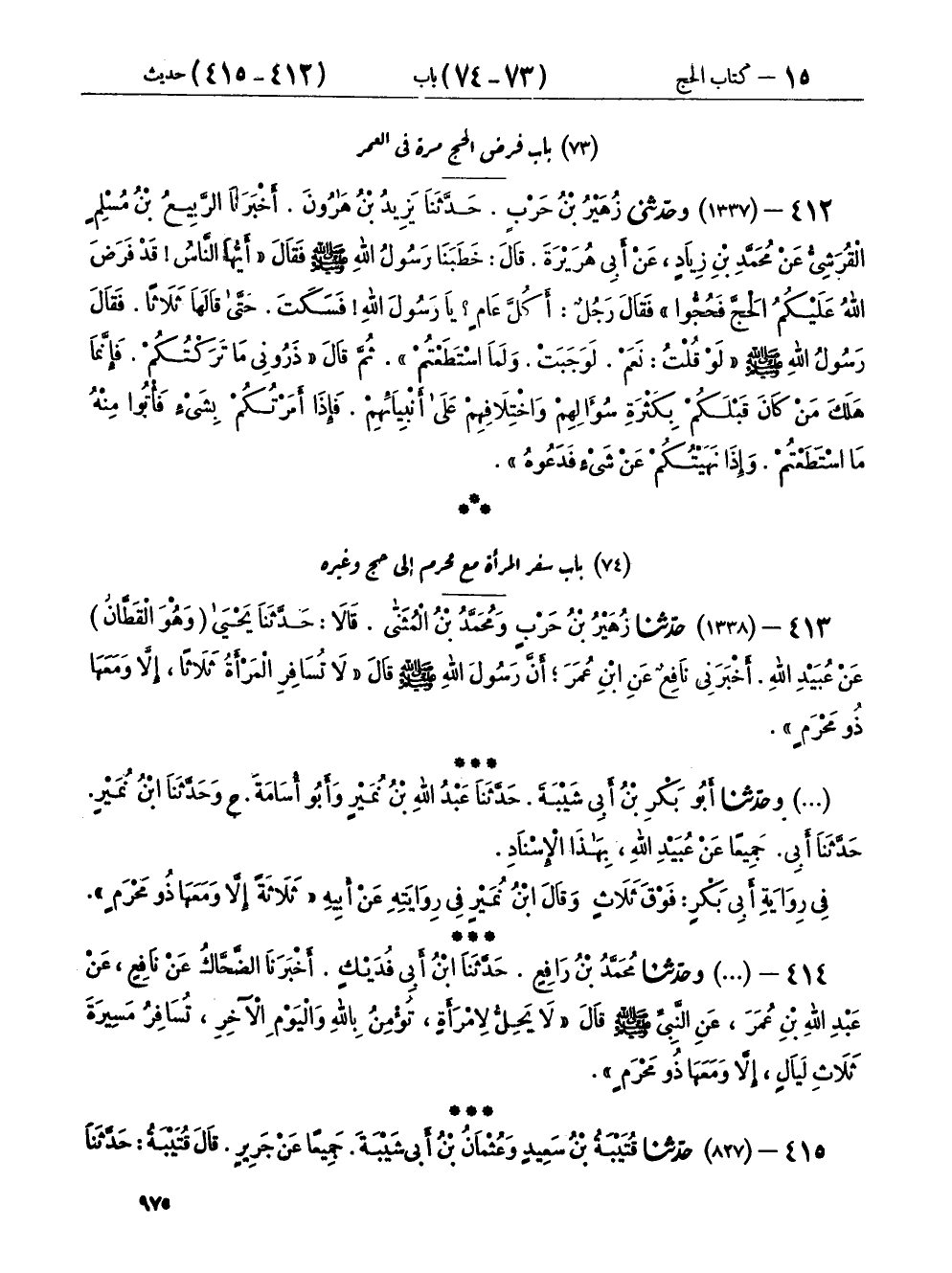 ٤١٢ - (١٣٣٧) وحَدَّثَنِي زُهَيْرُ بْنُ حَرْبٍ، حَدَّثَنَا يَزِيدُ بْنُ هَارُونَ، أَخْبَرَنَا الرَّبِيعُ بْنُ مُسْلِمٍ الْقُرَشِيُّ، عَنْ مُحَمَّدِ بْنِ زِيَادٍ، عَنْ أَبِي هُرَيْرَةَ، قَالَ: خَطَبَنَا رَسُولُ اللهِ صَلَّى اللهُ عَلَيْهِ وَسَلَّمَ، فَقَالَ: «أَيُّهَا النَّاسُ قَدْ فَرَضَ اللهُ عَلَيْكُمُ الْحَجَّ، فَحُجُّوا»، فَقَالَ رَجُلٌ: أَكُلَّ عَامٍ يَا رَسُولَ اللهِ؟ فَسَكَتَ حَتَّى قَالَهَا ثَلَاثًا، فَقَالَ رَسُولُ اللهِ صَلَّى اللهُ عَلَيْهِ وَسَلَّمَ: " لَوْ قُلْتُ: نَعَمْ لَوَجَبَتْ، وَلَمَا اسْتَطَعْتُمْ "، ثُمَّ قَالَ: «ذَرُونِي مَا تَرَكْتُكُمْ، فَإِنَّمَا هَلَكَ مَنْ كَانَ قَبْلَكُمْ بِكَثْرَةِ سُؤَالِهِمْ وَاخْتِلَافِهِمْ عَلَى أَنْبِيَائِهِمْ، فَإِذَا أَمَرْتُكُمْ بِشَيْءٍ فَأْتُوا مِنْهُ مَا اسْتَطَعْتُمْ، وَإِذَا نَهَيْتُكُمْ عَنْ شَيْءٍ فَدَعُوهُ»