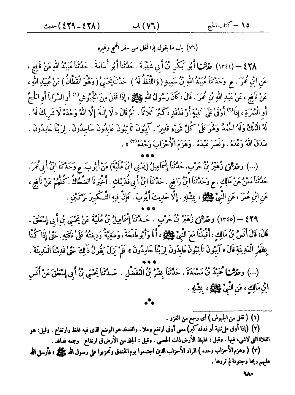 ٤٢٨ - (١٣٤٤) حَدَّثَنَا أَبُو بَكْرِ بْنُ أَبِي شَيْبَةَ، حَدَّثَنَا أَبُو أُسَامَةَ، حَدَّثَنَا عُبَيْدُ اللهِ، عَنْ نَافِعٍ، عَنِ ابْنِ عُمَرَ، ح وحَدَّثَنَا عُبَيْدُ اللهِ بْنُ سَعِيدٍ، وَاللَّفْظُ لَهُ، حَدَّثَنَا يَحْيَى وَهُوَ الْقَطَّانُ، عَنْ عُبَيْدِ اللهِ، عَنْ نَافِعٍ، عَنْ عَبْدِ اللهِ بْنِ عُمَرَ، قَالَ: كَانَ رَسُولُ اللهِ صَلَّى اللهُ عَلَيْهِ وَسَلَّمَ إِذَا قَفَلَ مِنَ الْجُيُوشِ، أَوِ السَّرَايَا، أَوِ الْحَجِّ، أَوِ الْعُمْرَةِ، إِذَا أَوْفَى عَلَى ثَنِيَّةٍ أَوْ فَدْفَدٍ، كَبَّرَ ثَلَاثًا، ثُمَّ قَالَ: «لَا إِلَهَ إِلَّا اللهُ وَحْدَهُ لَا شَرِيكَ لَهُ، لَهُ الْمُلْكُ وَلَهُ الْحَمْدُ وَهُوَ عَلَى كُلِّ شَيْءٍ قَدِيرٌ، آيِبُونَ تَائِبُونَ عَابِدُونَ سَاجِدُونَ لِرَبِّنَا حَامِدُونَ، صَدَقَ اللهُ وَعْدَهُ، وَنَصَرَ عَبْدَهُ، وَهَزَمَ الْأَحْزَابَ وَحْدَهُ»،