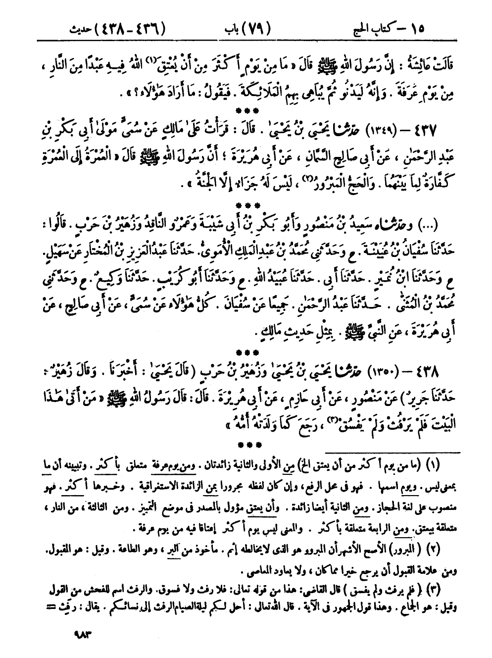 ٤٣٨ - (١٣٥٠) حَدَّثَنَا يَحْيَى بْنُ يَحْيَى، وَزُهَيْرُ بْنُ حَرْبٍ، قَالَ يَحْيَى: أَخْبَرَنَا، وقَالَ زُهَيْرٌ: حَدَّثَنَا جَرِيرٌ، عَنْ مَنْصُورٍ، عَنْ أَبِي حَازِمٍ، عَنْ أَبِي هُرَيْرَةَ، قَالَ: قَالَ رَسُولُ اللهِ صَلَّى اللهُ عَلَيْهِ وَسَلَّمَ: «مَنْ أَتَى هَذَا الْبَيْتَ، فَلَمْ يَرْفُثْ، وَلَمْ يَفْسُقْ، رَجَعَ كَمَا وَلَدَتْهُ أُمُّهُ»،