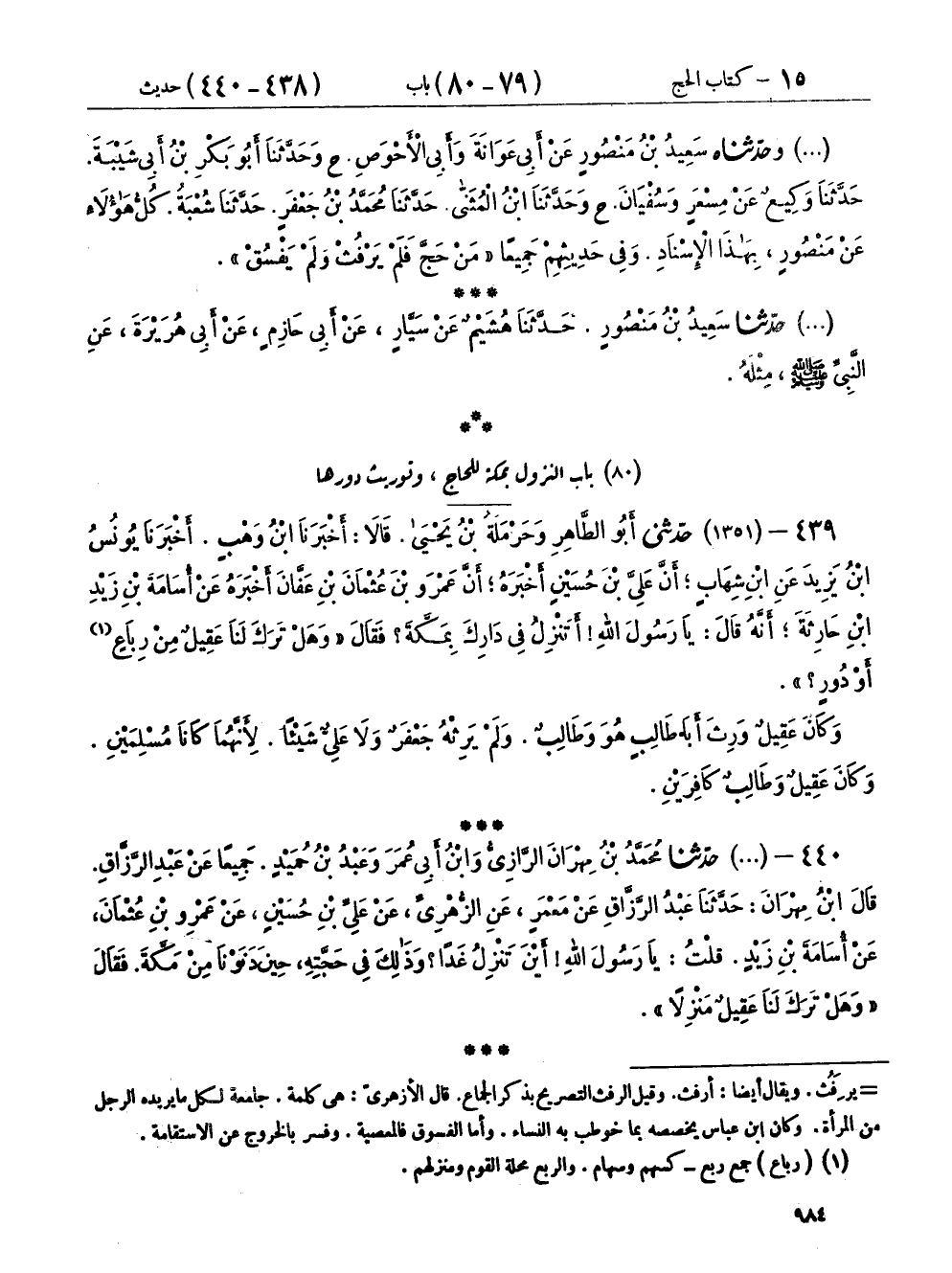 ٤٣٩ - (١٣٥١) حَدَّثَنِي أَبُو الطَّاهِرِ، وَحَرْمَلَةُ بْنُ يَحْيَى، قَالَا: أَخْبَرَنَا ابْنُ وَهْبٍ، أَخْبَرَنَا يُونُسُ بْنُ يَزِيدَ، عَنِ ابْنِ شِهَابٍ، أَنَّ عَلِيَّ بْنَ حُسَيْنٍ، أَخْبَرَهُ، أَنَّ عَمْرَو بْنَ عُثْمَانَ بْنِ عَفَّانَ، أَخْبَرَهُ، عَنْ أُسَامَةَ بْنِ زَيْدِ بْنِ حَارِثَةَ، أَنَّهُ قَالَ: يَا رَسُولَ اللهِ، أَتَنْزِلُ فِي دَارِكَ بِمَكَّةَ؟ فَقَالَ «وَهَلْ تَرَكَ لَنَا عَقِيلٌ مِنْ رِبَاعٍ، أَوْ دُورٍ»، «وَكَانَ عَقِيلٌ وَرِثَ أَبَا طَالِبٍ هُوَ وَطَالِبٌ، وَلَمْ يَرِثْهُ جَعْفَرٌ، وَلَا عَلِيٌّ شَيْئًا لِأَنَّهُمَا كَانَا مُسْلِمَيْنِ، وَكَانَ عَقِيلٌ وَطَالِبٌ كَافِرَيْنِ»