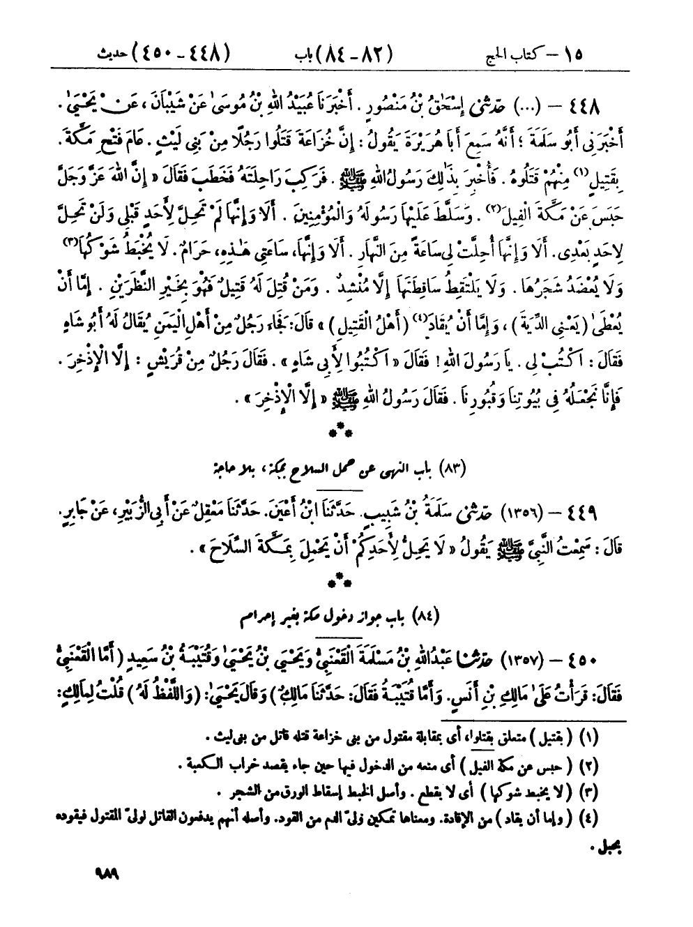 ٤٤٨ - (١٣٥٥) حَدَّثَنِي إِسْحَاقُ بْنُ مَنْصُورٍ، أَخْبَرَنَا عُبَيْدُ اللهِ بْنُ مُوسَى، عَنْ شَيْبَانَ، عَنْ يَحْيَى، أَخْبَرَنِي أَبُو سَلَمَةَ، أَنَّهُ سَمِعَ أَبَا هُرَيْرَةَ، يَقُولُ: إِنَّ خُزَاعَةَ قَتَلُوا رَجُلًا مِنْ بَنِي لَيْثٍ عَامَ فَتْحِ مَكَّةَ بِقَتِيلٍ مِنْهُمْ قَتَلُوهُ، فَأُخْبِرَ بِذَلِكَ رَسُولُ اللهِ صَلَّى اللهُ عَلَيْهِ وَسَلَّمَ، فَرَكِبَ رَاحِلَتَهُ، فَخَطَبَ، فَقَالَ: " إِنَّ اللهَ عَزَّ وَجَلَّ حَبَسَ عَنْ مَكَّةَ الْفِيلَ، وَسَلَّطَ عَلَيْهَا رَسُولَهُ وَالْمُؤْمِنِينَ، أَلَا وَإِنَّهَا لَمْ تَحِلَّ لِأَحَدٍ قَبْلِي، وَلَنْ تَحِلَّ لِأَحَدٍ بَعْدِي، أَلَا وَإِنَّهَا أُحِلَّتْ لِي سَاعَةً مِنَ النَّهَارِ، أَلَا وَإِنَّهَا سَاعَتِي هَذِهِ حَرَامٌ، لَا يُخْبَطُ شَوْكُهَا، وَلَا يُعْضَدُ شَجَرُهَا، وَلَا يَلْتَقِطُ سَاقِطَتَهَا إِلَّا مُنْشِدٌ، وَمَنْ قُتِلَ لَهُ قَتِيلٌ فَهُوَ بِخَيْرِ النَّظَرَيْنِ: إِمَّا أَنْ يُعْطَى - يَعْنِي الدِّيَةَ -، وَإِمَّا أَنْ يُقَادَ - أَهْلُ الْقَتِيلِ - "، قَالَ: فَجَاءَ رَجُلٌ مِنْ أَهْلِ الْيَمَنِ يُقَالُ لَهُ أَبُو شَاهٍ، فَقَالَ: اكْتُبْ لِي يَا رَسُولَ اللهِ، فَقَالَ: «اكْتُبُوا لِأَبِي شَاهٍ»، فَقَالَ رَجُلٌ مِنْ قُرَيْشٍ: إِلَّا الْإِذْخِرَ، فَإِنَّا نَجْعَلُهُ فِي بُيُوتِنَا وَقُبُورِنَا، فَقَالَ رَسُولُ اللهِ صَلَّى اللهُ عَلَيْهِ وَسَلَّمَ: «إِلَّا الْإِذْخِرَ»