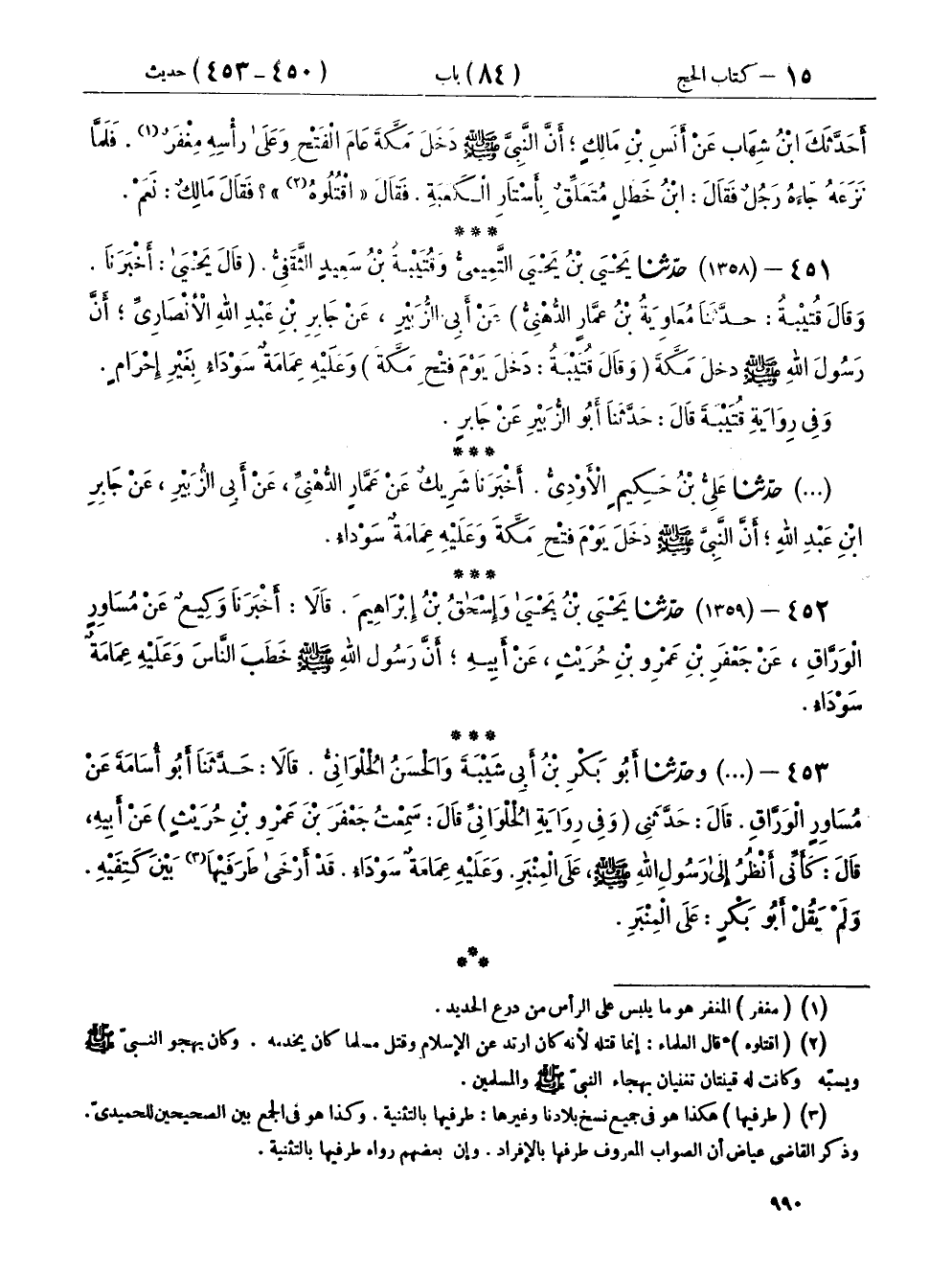٤٥١ - (١٣٥٨) حَدَّثَنَا يَحْيَى بْنُ يَحْيَى التَّمِيمِيُّ، وَقُتَيْبَةُ بْنُ سَعِيدٍ الثَّقَفِيُّ، قَالَ يَحْيَى: أَخْبَرَنَا، وقَالَ قُتَيْبَةُ: حَدَّثَنَا مُعَاوِيَةُ بْنُ عَمَّارٍ الدُّهْنِيُّ، عَنْ أَبِي الزُّبَيْرِ، عَنْ جَابِرِ بْنِ عَبْدِ اللهِ الْأَنْصَارِيِّ، " أَنَّ رَسُولَ اللهِ صَلَّى اللهُ عَلَيْهِ وَسَلَّمَ دَخَلَ مَكَّةَ - وَقَالَ قُتَيْبَةُ: دَخَلَ يَوْمَ فَتْحِ مَكَّةَ - وَعَلَيْهِ عِمَامَةٌ سَوْدَاءُ بِغَيْرِ إِحْرَامٍ "، وَفِي رِوَايَةِ قُتَيْبَةَ، قَالَ: حَدَّثَنَا أَبُو الزُّبَيْرِ، عَنْ جَابِرٍ