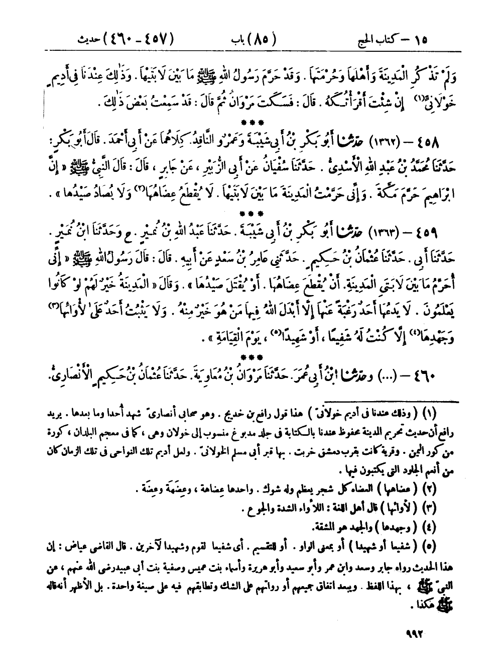 ٤٥٩ - (١٣٦٣) حَدَّثَنَا أَبُو بَكْرِ بْنُ أَبِي شَيْبَةَ، حَدَّثَنَا عَبْدُ اللهِ بْنُ نُمَيْرٍ، ح وحَدَّثَنَا ابْنُ نُمَيْرٍ، حَدَّثَنَا أَبِي، حَدَّثَنَا عُثْمَانُ بْنُ حَكِيمٍ، حَدَّثَنِي عَامِرُ بْنُ سَعْدٍ، عَنْ أَبِيهِ، قَالَ: قَالَ رَسُولُ اللهِ صَلَّى اللهُ عَلَيْهِ وَسَلَّمَ: «إِنِّي أُحَرِّمُ مَا بَيْنَ لَابَتَيِ الْمَدِينَةِ أَنْ يُقْطَعَ عِضَاهُهَا، أَوْ يُقْتَلَ صَيْدُهَا»، وَقَالَ: «الْمَدِينَةُ خَيْرٌ لَهُمْ لَوْ كَانُوا يَعْلَمُونَ، لَا يَدَعُهَا أَحَدٌ رَغْبَةً عَنْهَا إِلَّا أَبْدَلَ اللهُ فِيهَا مَنْ هُوَ خَيْرٌ مِنْهُ، وَلَا يَثْبُتُ أَحَدٌ عَلَى لَأْوَائِهَا وَجَهْدِهَا إِلَّا كُنْتُ لَهُ شَفِيعًا، أَوْ شَهِيدًا يَوْمَ الْقِيَامَةِ»،