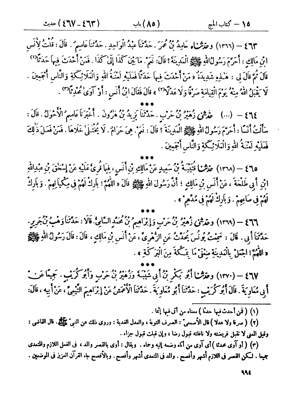 ٤٦٤ - (١٣٦٦) حَدَّثَنِي زُهَيْرُ بْنُ حَرْبٍ، حَدَّثَنَا يَزِيدُ بْنُ هَارُونَ، أَخْبَرَنَا عَاصِمٌ الْأَحْوَلُ، قَالَ: سَأَلْتُ أَنَسًا، أَحَرَّمَ رَسُولُ اللهِ صَلَّى اللهُ عَلَيْهِ وَسَلَّمَ الْمَدِينَةَ؟ قَالَ: «نَعَمْ، هِيَ حَرَامٌ لَا يُخْتَلَى خَلَاهَا، فَمَنْ فَعَلَ ذَلِكَ فَعَلَيْهِ لَعْنَةُ اللهِ وَالْمَلَائِكَةِ وَالنَّاسِ أَجْمَعِينَ»