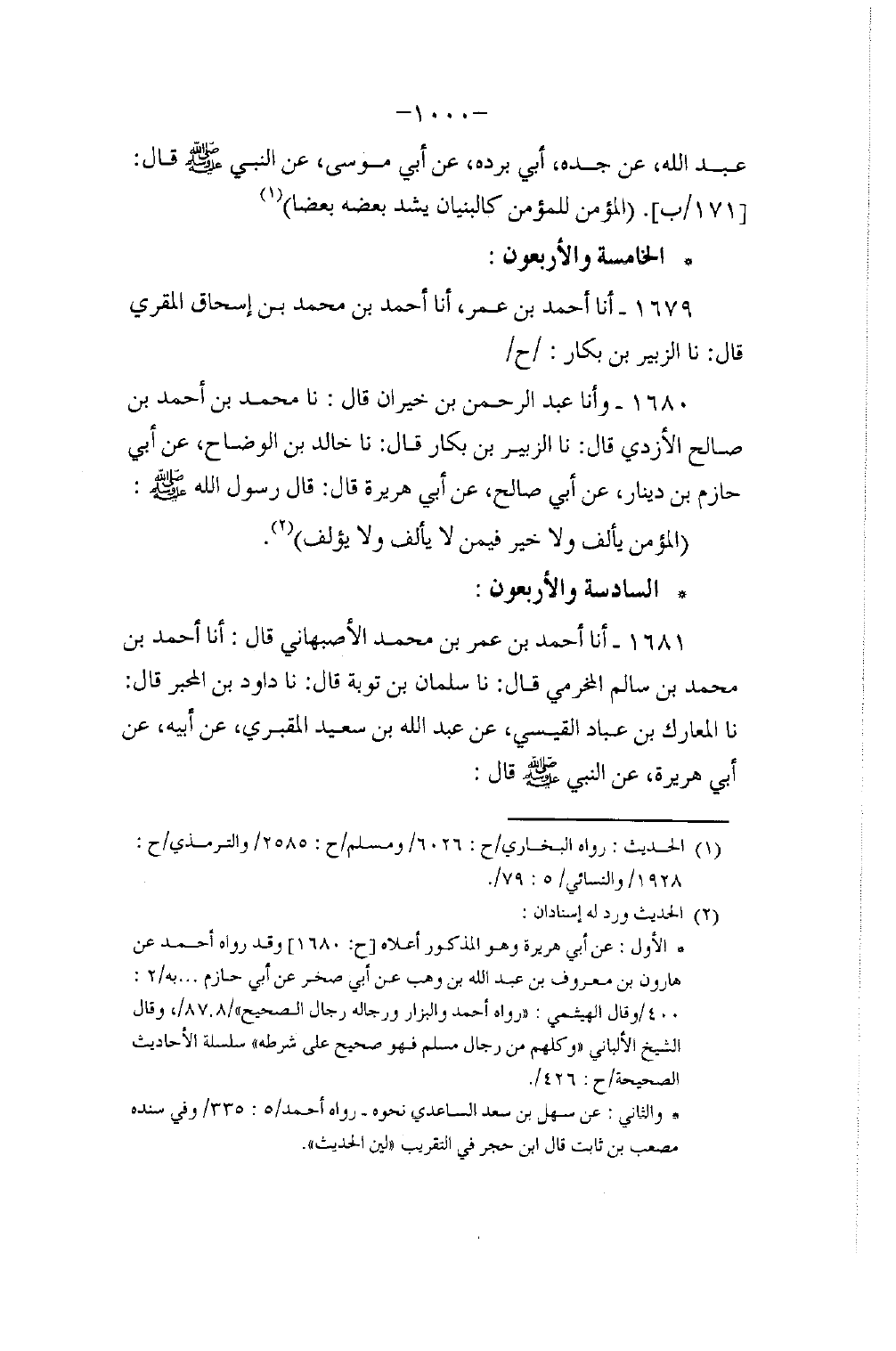 1680 - وأنا عَبْدُ الرَّحْمَنِ بْنُ خَيْرَانَ، قَالَ: نا مُحَمَّدُ بْنُ أَحْمَدَ بْنِ صَالِحٍ الْأَزْدِيُّ، قَالَ: نا الزُّبَيْرُ بْنُ بَكَّارٍ، قَالَ خَالِدُ بْنُ الْوَضَّاحِ، عَنْ أَبِي حَازِمِ بْنِ دِينَارٍ، عَنْ أَبِي صَالِحٍ، عَنْ أَبِي هُرَيْرَةَ، قَالَ: قَالَ رَسُولُ اللَّهِ صَلَّى اللهُ عَلَيْهِ وَسَلَّمَ: «§الْمُؤْمِنُ يَأْلَفُ، وَلَا خَيْرَ فِيمَنْ لَا يَأْلَفُ وَلَا يُؤْلَفُ»