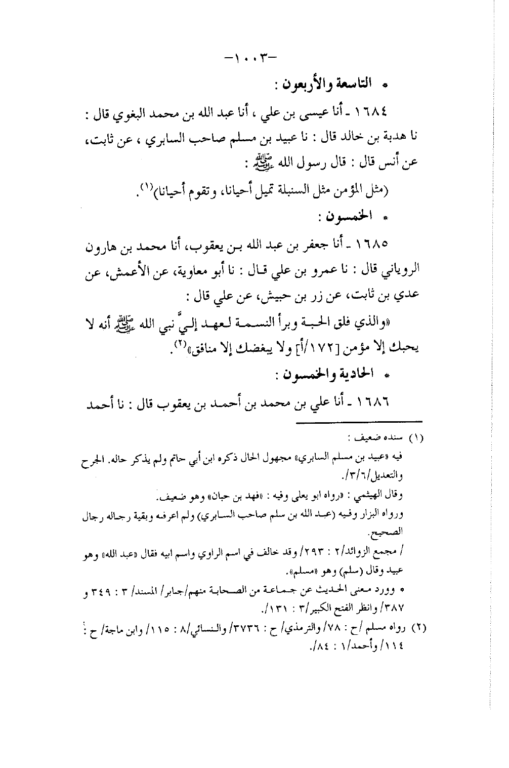 1685 - أنا جَعْفَرُ بْنُ عَبْدِ اللَّهِ بْنِ يَعْقُوبَ، أنا مُحَمَّدُ بْنُ هَارُونَ الرُّويَانِيُّ، قَالَ: نا عَمْرُو بْنُ عَلِيٍّ، قَالَ: نا أَبُو مُعَاوِيَةَ، عَنِ الْأَعْمَشِ، عَنْ عَدِيِّ بْنِ ثَابِتٍ، عَنْ زِرِّ بْنِ حُبَيْشٍ، عَنْ عَلِيٍّ، قَالَ: وَالَّذِي فَلَقَ الْحَبَّةَ، وَبَرَأَ النَّسَمَةَ لَعَهِدَ إِلَيَّ نَبِيُّ اللَّهِ صَلَّى اللهُ عَلَيْهِ وَسَلَّمَ «أَنَّهُ §لَا يُحِبُّكَ إِلَّا مُؤْمِنٌ وَلَا يُبْغِضُكَ إِلَّا مُنَافِقٌ»
