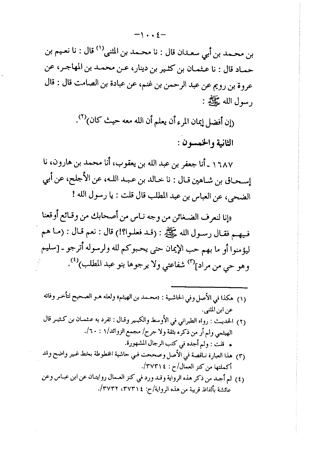 1687 - أنا جَعْفَرُ بْنُ عَبْدِ اللَّهِ بْنِ يَعْقُوبَ، أنا مُحَمَّدُ بْنُ هَارُونَ، نا إِسْحَاقُ بْنُ شَاهِينَ، قَالَ: نا خَالِدُ بْنُ عَبْدِ اللَّهِ، عَنِ الْأَجْلَحِ، عَنْ أَبِي الضُّحَى، عَنِ الْعَبَّاسِ بْنِ عَبْدِ الْمُطَّلِبِ، قَالَ: إِنَّا لَنَعْرِفُ الضَّغَائِنَ مِنْ وَجْهِ نَاسٍ مِنْ أَصْحَابِكَ مِنْ وَقَائِعَ أَوْقَعَتْنَا فِيهِمْ، فَقَالَ رَسُولُ اللَّهِ صَلَّى اللهُ عَلَيْهِ وَسَلَّمَ: «قَدْ فَعَلُوا؟» قَالَ: نَعَمْ، قَالَ: «§مَا هُمْ لِيُؤْمِنُوا، أَوْ مَا لَهُمْ حُبُّ الْإِيمَانِ، حَتَّى يُحِبُّوكُمْ لِلَّهِ وَلِرَسُولِهِ أَتَرْجُو سُلَيْمٌ، وَهُوَ حَيٌّ مِنْ مُرَادٍ، شَفَاعَتِي وَلَا يَرْجُوهَا بَنُو عَبْدِ الْمُطَّلِبِ»