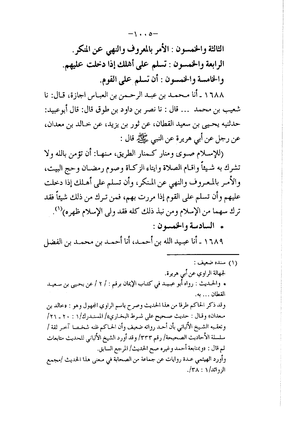 1688 - أنا مُحَمَّدُ بْنُ عَبْدِ الرَّحْمَنِ بْنِ الْعَبَّاسِ إِجَازَةً، قَالَ شُعَيْبُ بْنُ مُحَمَّدٍ، قَالَ: نا نَصْرُ بْنُ دَاوُدَ بْنِ طَوْقٍ، قَالَ: قَالَ أَبُو عُبَيْدٍ: حَدَّثَنِيهِ يَحْيَى بْنُ سَعِيدٍ الْقَطَّانُ، عَنْ ثَوْرِ بْنِ يَزِيدَ، عَنْ خَالِدِ بْنِ مَعْدَانَ، عَنْ رَجُلٍ، عَنْ أَبِي هُرَيْرَةَ، عَنِ النَّبِيِّ صَلَّى اللهُ عَلَيْهِ وَسَلَّمَ أَنَّهُ قَالَ: " §لِلْإِسْلَامِ صُوًى وَمَنَارٌ كَمَنَارِ الطَّرِيقِ مِنْهَا: أَنْ تُؤْمِنَ بِاللَّهِ وَلَا تُشْرِكَ بِهِ شَيْئًا، وَإِقَامُ الصَّلَاةِ، وَإِيتَاءُ الزَّكَاةِ، وَصَوْمُ رَمَضَانَ، وَحَجُّ الْبَيْتِ، وَالْأَمْرُ بِالْمَعْرُوفِ، وَالنَّهْيُ عَنِ الْمُنْكَرِ، وَأَنْ تُسَلِّمَ عَلَى أَهْلِكَ إِذَا دَخَلْتَ عَلَيْهِمْ، وَأَنْ تُسَلِّمَ عَلَى الْقَوْمِ إِذَا مَرَرْتَ بِهِمْ، فَمَنْ تَرَكَ مِنْ ذَلِكَ شَيْئًا فَقَدْ تَرَكَ سَهْمًا مِنَ الْإِسْلَامِ، وَمَنْ نَبَذَ ذَلِكَ كُلَّهُ فَقَدْ وَلَّى الْإِسْلَامَ ظَهْرَهُ "