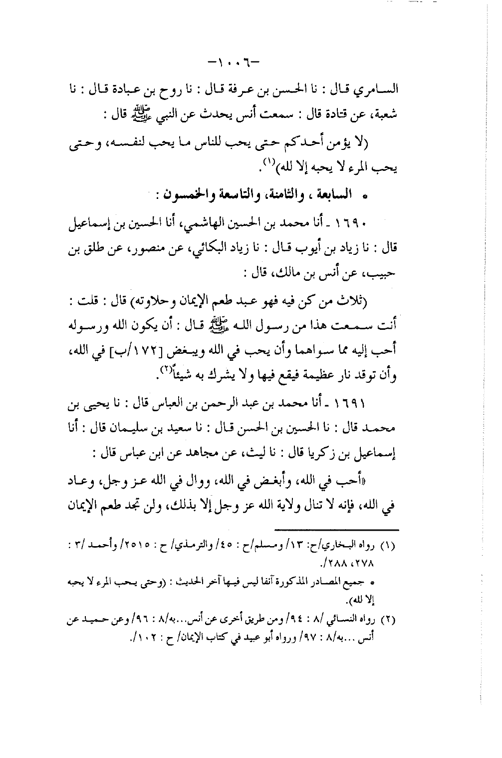 1690 - أنا مُحَمَّدُ بْنُ الْحُسَيْنِ الْهَاشِمِيُّ، أنا الْحُسَيْنُ بْنُ إِسْمَاعِيلَ، قَالَ: نا زِيَادُ بْنُ أَيُّوبَ، قَالَ: نا زِيَادٌ الْبَكَّائِيُّ، عَنْ مَنْصُورٍ، عَنْ طَلْقِ بْنِ حَبِيبٍ، عَنْ أَنَسِ بْنِ مَالِكٍ، قَالَ: §«ثَلَاثٌ مَنْ كُنَّ فِيهِ فَهُوَ عَبْدٌ طَعِمَ الْإِيمَانَ وَحَلَاوَتَهُ» قَالَ: قُلْتُ: أَنْتَ سَمِعْتَ هَذَا مِنْ رَسُولِ اللَّهِ صَلَّى اللهُ عَلَيْهِ وَسَلَّمَ؟ قَالَ: «أَنْ يَكُونَ اللَّهُ وَرَسُولُهُ أَحَبَّ إِلَيْهِ مِمَّا سِوَاهُمَا وَأَنْ يُحِبَّ فِي اللَّهِ وَيُبْغِضَ فِي اللَّهِ، وَأَنْ تُوقَدَ نَارٌ عَظِيمَةٌ فَيَقَعَ فِيهَا وَلَا يُشْرِكَ بِهِ شَيْئًا»