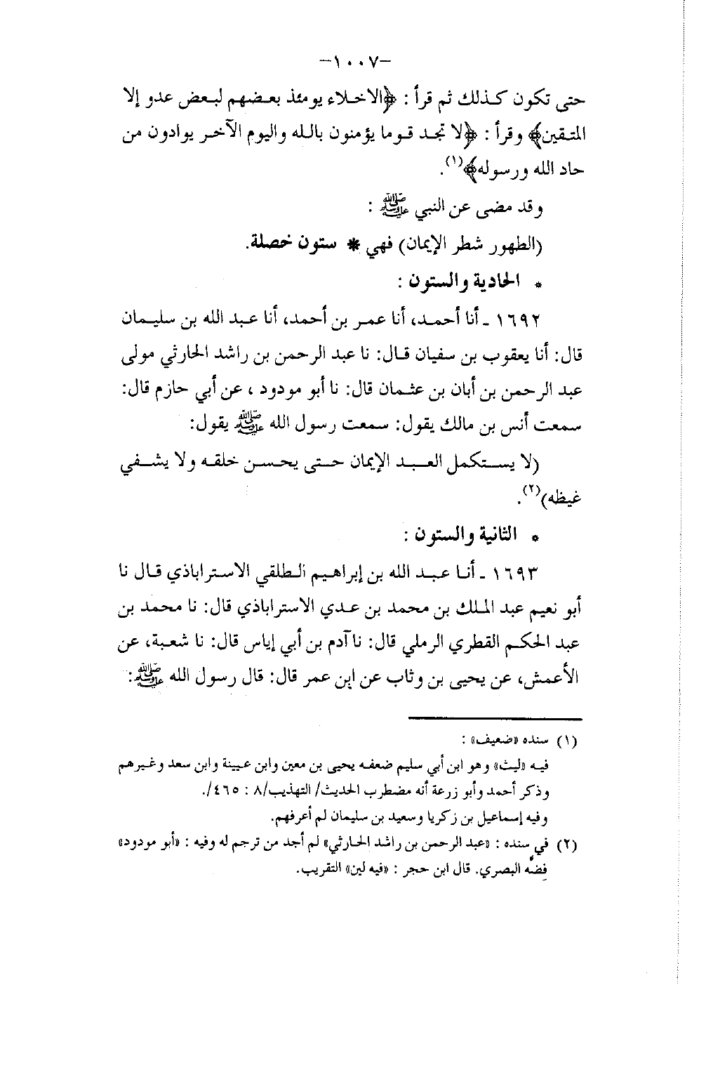 1693 - أنا عَبْدُ اللَّهِ بْنُ إِبْرَاهِيمَ الطَّلَقِيُّ الْإِسْتِرَابَاذِيُّ، قَالَ: نا أَبُو نُعَيْمٍ عَبْدُ الْمَلِكِ بْنُ مُحَمَّدِ بْنِ عَدِيٍّ الْإِسْتِرَابَاذِيُّ، قَالَ: نا مُحَمَّدُ بْنُ عَبْدِ الْحَكَمِ الْقَطْرِيُّ الرَّمْلِيُّ، قَالَ: نا آدَمُ بْنُ أَبِي إِيَاسٍ، قَالَ: نا شُعْبَةُ، عَنِ الْأَعْمَشِ، عَنْ يَحْيَى بْنِ وَثَّابٍ، عَنِ ابْنِ عُمَرَ، قَالَ: قَالَ رَسُولُ اللَّهِ صَلَّى اللهُ عَلَيْهِ وَسَلَّمَ -[1008]-: §«الْمُؤْمِنُ الَّذِي يُخَالِطُ النَّاسَ وَيَصْبِرُ عَلَى أَذَاهُمْ أَفْضَلُ مِنَ الَّذِي لَا يُخَالِطُ النَّاسَ وَلَا يَصْبِرُ عَلَى أَذَاهُمْ»