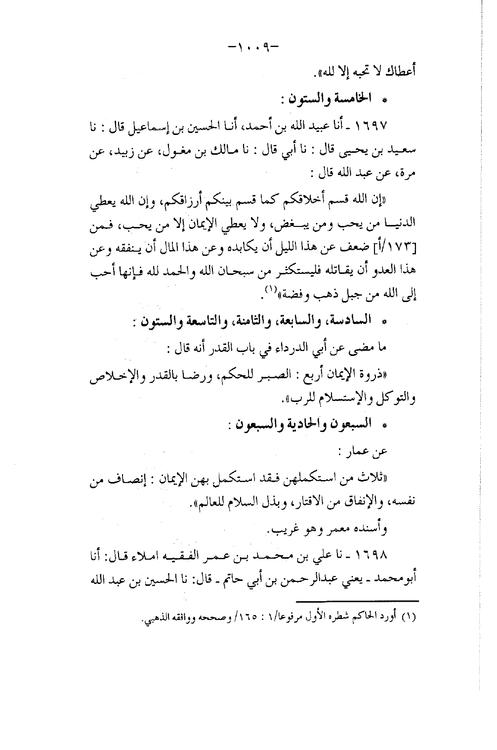 1697 - أنا عُبَيْدُ اللَّهِ بْنُ أَحْمَدَ، أنا الْحُسَيْنُ بْنُ إِسْمَاعِيلَ، قَالَ: نا سَعِيدُ بْنُ يَحْيَى، قَالَ: نا أَبِي قَالَ: نا مَالِكُ بْنُ مِغْوَلٍ، عَنْ زُبَيْدٍ، عَنْ مُرَّةَ، عَنْ عَبْدِ اللَّهِ، قَالَ: «إِنَّ اللَّهَ قَسَّمَ أَخْلَاقَكُمْ كَمَا قَسَّمَ بَيْنَكُمْ أَرْزَاقَكُمْ، وَإِنَّ اللَّهَ §يُعْطِي الدُّنْيَا مَنْ يُحِبُّ وَمَنْ يُبْغِضُ، وَلَا يُعْطِي الْإِيمَانَ إِلَّا مَنْ يُحِبُّ، فَمَنْ ضَعُفَ عَنْ هَذَا اللَّيْلِ أَنْ يُكَابِدَهُ، وَعَنْ هَذَا الْمَالِ أَنْ يُنْفِقَهُ، وَعَنْ هَذَا الْعَدُوِّ أَنْ يُقَاتِلَهُ فَلْيَسْتَكْثِرْ مِنْ سُبْحَانَ اللَّهِ، وَالْحَمْدُ لِلَّهِ؛ فَإِنَّهَا أَحَبُّ إِلَى اللَّهِ مِنْ جَبَلِ ذَهَبٍ وَفِضَّةٍ»