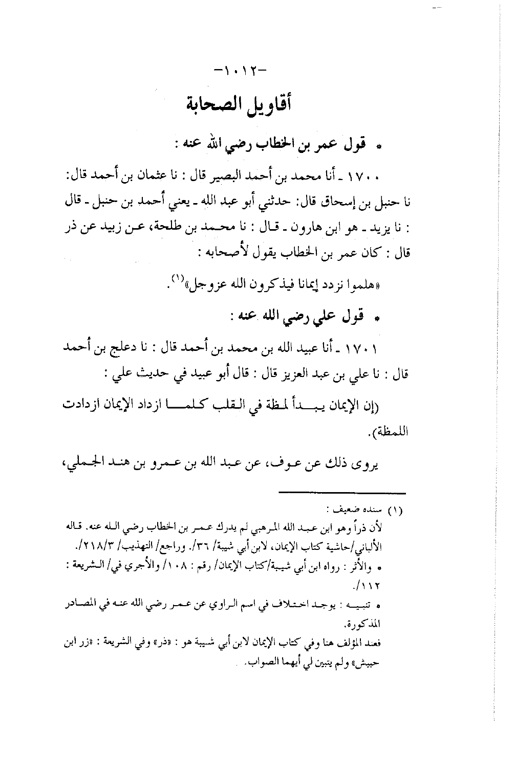 1700 - أنا مُحَمَّدُ بْنُ أَحْمَدَ الْبَصِيرُ، قَالَ: نا عُثْمَانُ بْنُ أَحْمَدَ، قَالَ: نا حَنْبَلُ بْنُ إِسْحَاقَ، قَالَ: حَدَّثَنِي أَبُو عَبْدِ اللَّهِ، يَعْنِي أَحْمَدَ بْنَ حَنْبَلٍ قَالَ: نا يَزِيدُ هُوَ ابْنُ هَارُونَ قَالَ: نا مُحَمَّدُ بْنُ طَلْحَةَ، عَنْ زُبَيْدٍ، عَنْ ذَرٍّ، قَالَ: كَانَ عُمَرُ بْنُ الْخَطَّابِ يَقُولُ لِأَصْحَابِهِ: §«هَلُمُّوا نَزْدَدْ إِيمَانًا» فَيَذْكُرُونَ اللَّهَ عَزَّ وَجَلَّ