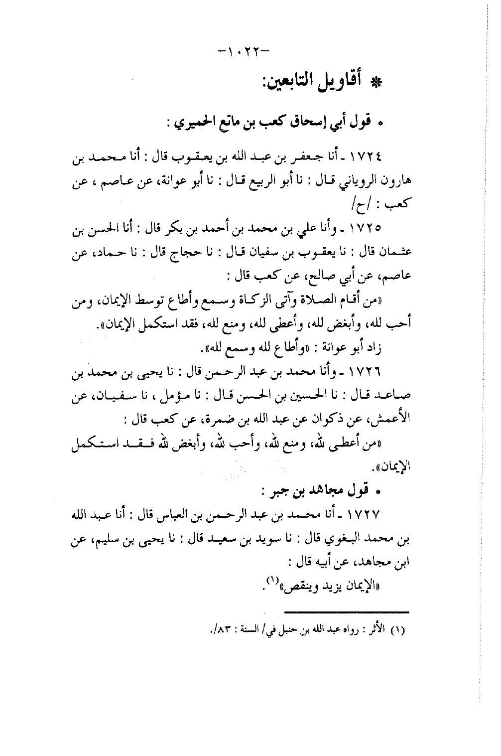 أنا مُحَمَّدُ بْنُ عَبْدِ الرَّحْمَنِ بْنِ الْعَبَّاسِ، قَالَ: أنا عَبْدُ اللَّهِ بْنُ مُحَمَّدٍ الْبَغَوِيُّ، قَالَ: نا سُوَيْدُ بْنُ سَعِيدٍ، قَالَ: نا يَحْيَى بْنُ سُلَيْمٍ، عَنِ ابْنِ مُجَاهِدٍ، عَنْ أَبِيهِ، قَالَ: §«الْإِيمَانُ يَزِيدُ وَيَنْقُصُ»