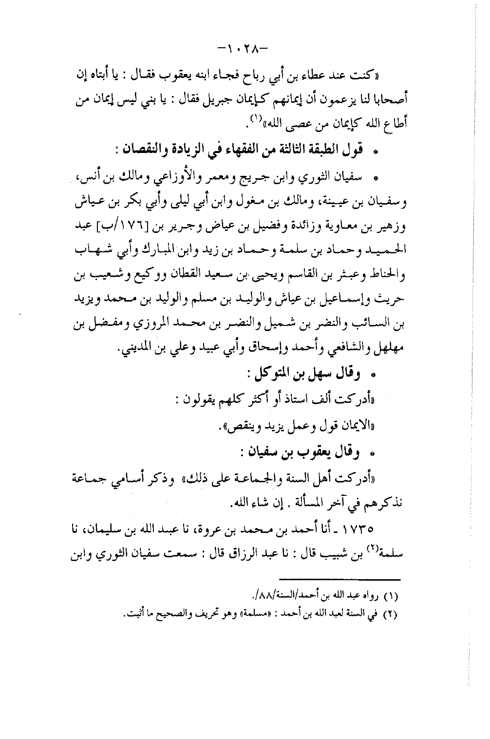 §قَوْلُ الطَّبَقَةِ الثَّالِثَةِ مِنَ الْفُقَهَاءِ فِي الزِّيَادَةِ وَالنُّقْصَانِ سُفْيَانَ الثَّوْرِيِّ، وَابْنِ جُرَيْجٍ، وَمَعْمَرٍ، وَالْأَوْزَاعِيِّ، وَمَالِكِ بْنِ أَنَسٍ، وَسُفْيَانَ بْنِ عُيَيْنَةَ، وَمَالِكِ بْنِ مِغْوَلٍ، وَابْنِ أَبِي لَيْلَى، وَأَبِي بَكْرِ بْنِ عَيَّاشٍ، وَزُهَيْرِ بْنِ مُعَاوِيَةَ، وَزَائِدَةَ، وَفُضَيْلِ بْنِ عِيَاضٍ، وَجَرِيرِ بْنِ عَبْدِ الْحَمِيدِ، وَحَمَّادِ بْنِ سَلَمَةَ، وَحَمَّادِ بْنِ زَيْدٍ، وَابْنِ الْمُبَارَكِ، وَأَبِي شِهَابٍ، وَالْحَنَّاطِ، وَعَبْثَرِ بْنِ الْقَاسِمِ، وَيَحْيَى بْنِ سَعِيدٍ الْقَطَّانِ، وَوَكِيعٍ، وَشُعَيْبِ بْنِ حُرَيْثٍ، وَإِسْمَاعِيلَ بْنِ عَيَّاشٍ، وَالْوَلِيدِ بْنِ مُسْلِمٍ، وَالْوَلِيدِ بْنِ مُحَمَّدٍ، وَيَزِيدَ بْنِ السَّائِبِ، وَالنَّضْرِ بْنِ شُمَيْلٍ، وَالنَّضْرِ بْنِ مُحَمَّدٍ الْمَرْوَزِيِّ، وَمُفَضَّلِ بْنِ مُهَلْهِلٍ، وَالشَّافِعِيِّ، وَأَحْمَدَ، وَإِسْحَاقَ، وَأَبِي عُبَيْدٍ، وَعَلِيِّ بْنِ الْمَدِينِيِّ وَقَالَ سَهْلُ بْنُ الْمُتَوَكِّلِ: " أَدْرَكْتُ أَلْفَ أُسْتَاذٍ أَوْ أَكْثَرَ، كُلُّهُمْ يَقُولُ: الْإِيمَانُ قَوْلٌ وَعَمَلٌ، يَزِيدُ وَيَنْقُصُ " وَقَالَ يَعْقُوبُ بْنُ سُفْيَانَ: «أَدْرَكْتُ أَهْلَ السُّنَّةِ وَالْجَمَاعَةِ عَلَى ذَلِكَ» وَذَكَرَ أَسَامِي جَمَاعَةٍ نَذْكُرُهُمْ فِي آخِرِ الْمَسْأَلَةِ، إِنْ شَاءَ اللَّهُ