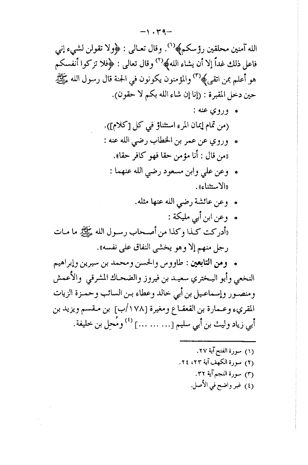 ، وَقَالَ تَعَالَى: {وَلَا تَقُولَنَّ لِشَيْءٍ إِنِّي فَاعِلٌ ذَلِكَ غَدًا إِلَّا أَنْ يَشَاءَ اللَّهُ} [الكهف: 24] ، وَقَالَ تَعَالَى: {فَلَا تُزَكُّوا أَنْفُسَكُمْ هُوَ أَعْلَمُ بِمَنِ اتَّقَى} [النجم: 32] وَالْمُؤْمِنُونَ يَكُونُونَ فِي الْجَنَّةِ، قَالَ رَسُولُ اللَّهِ صَلَّى اللهُ عَلَيْهِ وَسَلَّمَ حِينَ دَخَلَ الْمَقْبَرَةَ: «إِنَّا إِنْ شَاءَ اللَّهُ بِكُمْ لَاحِقُونَ» ، وَرُوِيَ عَنْهُ: «مِنْ تَمَامِ إِيمَانِ الْمَرْءِ اسْتِثْنَاؤُهُ فِي كُلِّ كَلَامٍ» . وَرُوِيَ عَنْ عُمَرَ بْنِ الْخَطَّابِ: " مَنْ قَالَ: أَنَا مُؤْمِنٌ حَقًّا فَهُوَ كَافِرٌ حَقًّا ". وَعَنْ عَلِيٍّ، وَابْنِ مَسْعُودٍ: «الِاسْتِثْنَاءُ» . وَعَنْ عَائِشَةَ مِثْلُهُ. وَعَنِ ابْنِ أَبِي مُلَيْكَةَ: «أَدْرَكْتُ كَذَا وَكَذَا مِنْ أَصْحَابِ رَسُولِ اللَّهِ صَلَّى اللهُ عَلَيْهِ وَسَلَّمَ مَا مَاتَ رَجُلٌ مِنْهُمْ إِلَّا وَهُوَ يَخْشَى النِّفَاقَ عَلَى نَفْسِهِ» وَمَنِ التَّابِعِينَ: طَاوسٌ، وَالْحَسَنُ، وَمُحَمَّدُ بْنُ سِيرِينَ، وَإِبْرَاهِيمُ النَّخَعِيُّ، وَأَبُو الْبَخْتَرِيِّ سَعِيدُ بْنُ فَيْرُوزَ، وَالضَّحَّاكُ الْمَشْرِقِيُّ، وَالْأَعْمَشُ، وَمَنْصُورٌ، وَإِسْمَاعِيلُ بْنُ أَبِي خَالِدٍ، وَعَطَاءُ بْنُ السَّائِبِ، وَحَمْزَةُ الزَّيَّاتُ الْمَغْرِبِيُّ، وَعُمَارَةُ بْنُ الْقَعْقَاعِ، وَمُغِيرَةُ بْنُ مِقْسَمٍ، وَيَزِيدُ بْنُ أَبِي زِيَادٍ، وَلَيْثُ بْنُ أَبِي سُلَيْمٍ، وَمُحِلُّ بْنُ خَلِيفَةَ