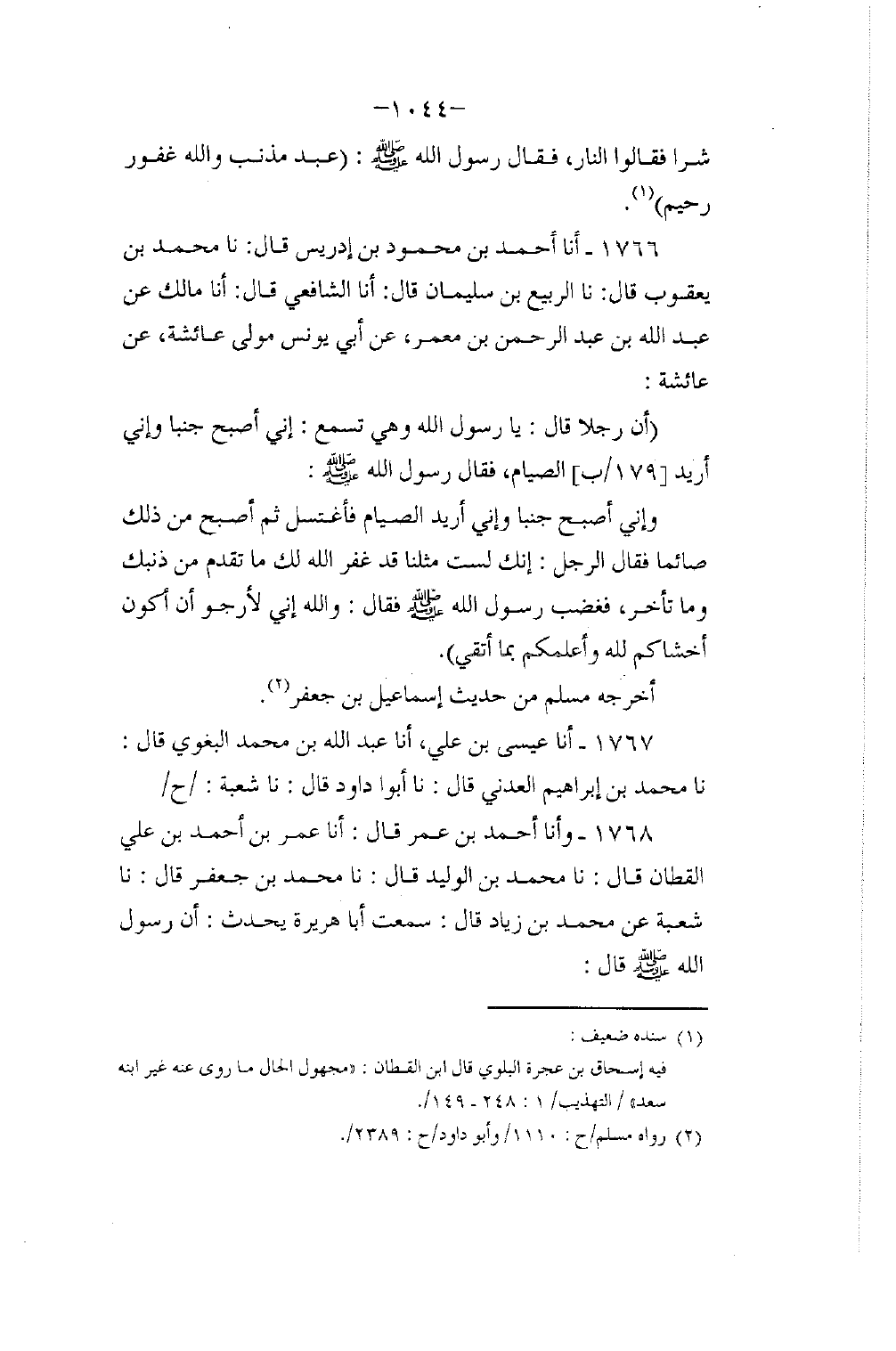 1766 - أنا أَحْمَدُ بْنُ مَحْمُودِ بْنِ إِدْرِيسَ، قَالَ: نا مُحَمَّدُ بْنُ يَعْقُوبَ، قَالَ: نا الرَّبِيعُ بْنُ سُلَيْمَانَ، قَالَ: أنا الشَّافِعِيُّ، قَالَ: أنا مَالِكٌ، عَنْ عَبْدِ اللَّهِ بْنِ عَبْدِ الرَّحْمَنِ بْنِ مَعْمَرٍ، عَنْ أَبِي يُونُسَ مَوْلَى عَائِشَةَ، عَنْ عَائِشَةَ أَنَّ رَجُلًا قَالَ: يَا رَسُولَ اللَّهِ وَهَيَ تَسْمَعُ: إِنِّي أُصْبِحُ جُنُبًا، وَإِنِّي أُرِيدُ الصِّيَامَ، فَقَالَ رَسُولُ اللَّهِ صَلَّى اللهُ عَلَيْهِ وَسَلَّمَ: «§وَإِنِّي أُصْبِحُ جُنُبًا، وَإِنِّي أُرِيدُ الصِّيَامَ، فَأَغْتَسِلُ، ثُمَّ أُصْبِحُ مِنْ ذَلِكَ صَائِمًا» ، فَقَالَ الرَّجُلُ: إِنَّكَ لَسْتَ مِثْلَنَا قَدْ غَفَرَ اللَّهُ لَكَ مَا تَقَدَّمَ مِنْ ذَنْبِكَ وَمَا تَأَخَّرَ، فَغَضِبَ رَسُولُ اللَّهِ صَلَّى اللهُ عَلَيْهِ وَسَلَّمَ فَقَالَ: «وَاللَّهِ إِنِّي لَأَرْجُو أَنْ أَكُونَ أَخْشَاكُمْ لِلَّهِ وَأَعْلَمَكُمْ بِمَا أَتَّقِي» . أَخْرَجَهُ مُسْلِمٌ مِنْ حَدِيثِ إِسْمَاعِيلَ بْنِ جَعْفَرٍ