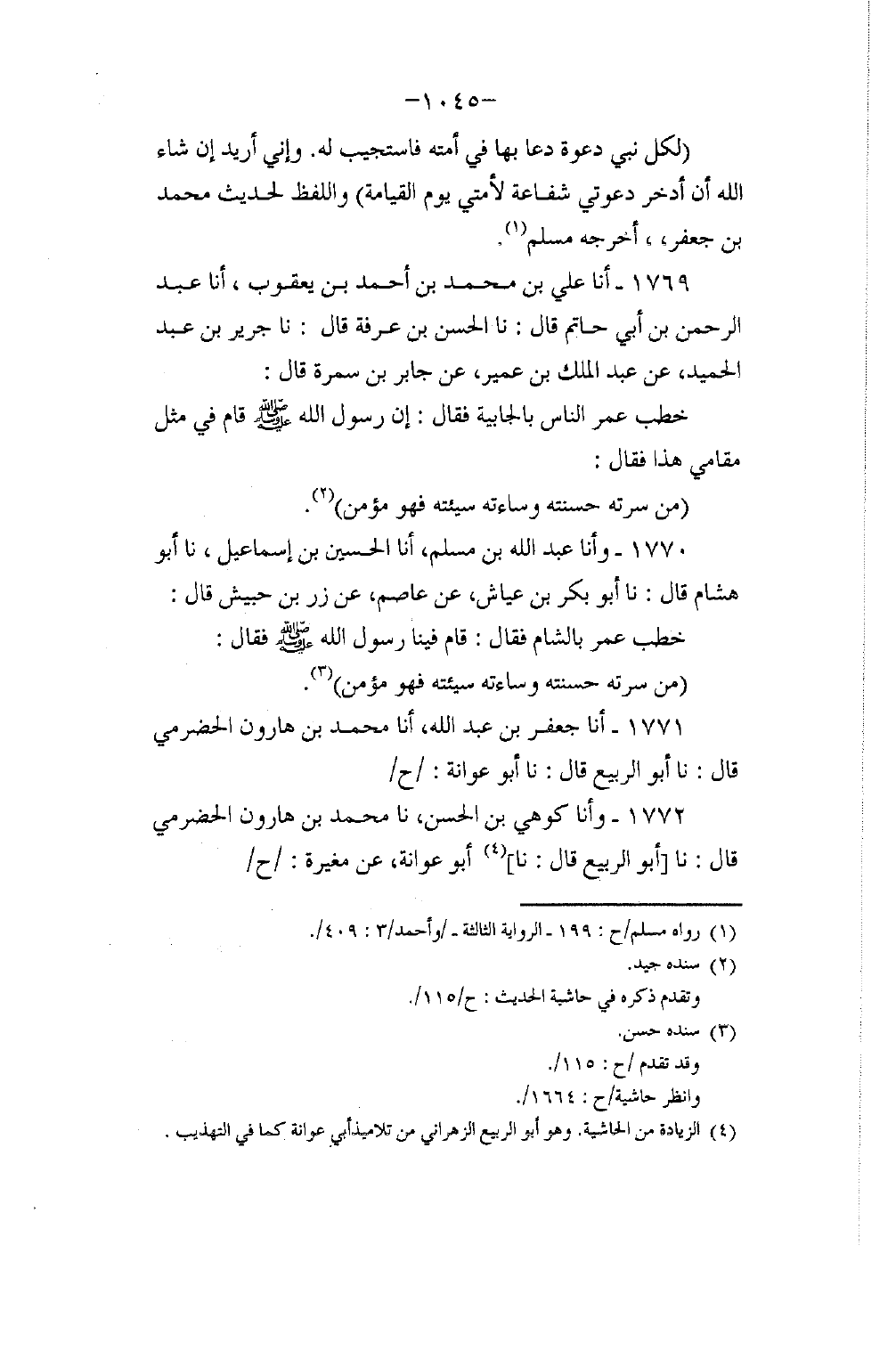 1770 - وَأَنَا عَبْدُ اللَّهِ بْنُ مُسْلِمٍ، أنا الْحُسَيْنُ بْنُ إِسْمَاعِيلَ، نا أَبُو هِشَامٍ، قَالَ: نا أَبُو بَكْرِ بْنُ عَيَّاشٍ، عَنْ عَاصِمٍ، عَنْ زِرِّ بْنِ حُبَيْشٍ، قَالَ: خَطَبَ عُمَرُ بِالشَّامِ، فَقَالَ: قَامَ فِينَا رَسُولُ اللَّهِ صَلَّى اللهُ عَلَيْهِ وَسَلَّمَ فَقَالَ: §«مَنْ سَرَّتْهُ حَسَنَتُهُ وَسَاءَتْهُ سَيِّئَتُهُ فَهُوَ مُؤْمِنٌ»