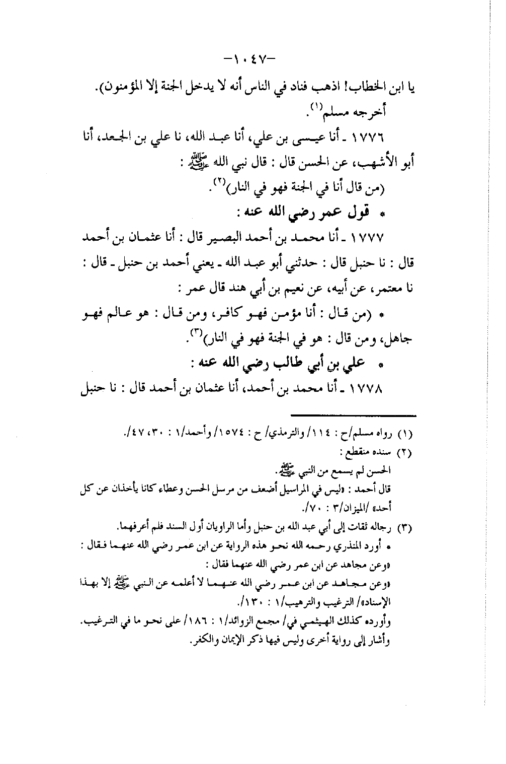 1777 - أنا مُحَمَّدُ بْنُ أَحْمَدَ الْبَصِيرُ، قَالَ: أنا عُثْمَانُ بْنُ أَحْمَدَ، قَالَ: نا حَنْبَلٌ، قَالَ: حَدَّثَنِي أَبُو عَبْدِ اللَّهِ يَعْنِي أَحْمَدَ بْنَ حَنْبَلٍ قَالَ: نا مُعْتَمِرٌ، عَنْ أَبِيهِ، عَنْ نُعَيْمِ بْنِ أَبِي هِنْدَ، قَالَ عُمَرُ: " §مَنْ قَالَ: أَنَا مُؤْمِنٌ فَهُوَ كَافِرٌ، وَمَنْ قَالَ: هُوَ عَالِمٌ فَهُوَ جَاهِلٌ، وَمَنْ قَالَ: هُوَ فِي الْجَنَّةِ فَهُوَ فِي النَّارِ "