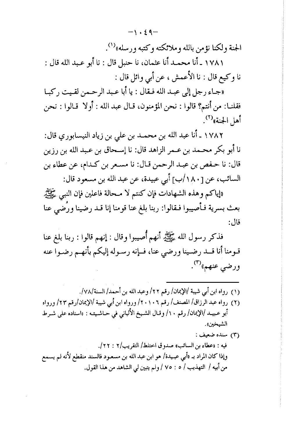 1781 - أنا مُحَمَّدٌ، أنا عُثْمَانُ، نا حَنْبَلٌ، قَالَ: نا أَبُو عَبْدِ اللَّهِ، قَالَ: نا وَكِيعٌ، قَالَ: نا الْأَعْمَشُ، عَنْ أَبِي وَائِلٍ، قَالَ: جَاءَ رَجُلٌ إِلَى عَبْدِ اللَّهِ فَقَالَ: يَا أَبَا عَبْدِ الرَّحْمَنِ، لَقِيتُ رَكْبًا، قُلْنَا: مَنْ أَنْتُمْ؟ قَالُوا: §نَحْنُ الْمُؤْمِنُونَ، قَالَ عَبْدُ اللَّهِ: " أَوَلَا قَالُوا: نَحْنُ أَهْلُ الْجَنَّةِ؟ "