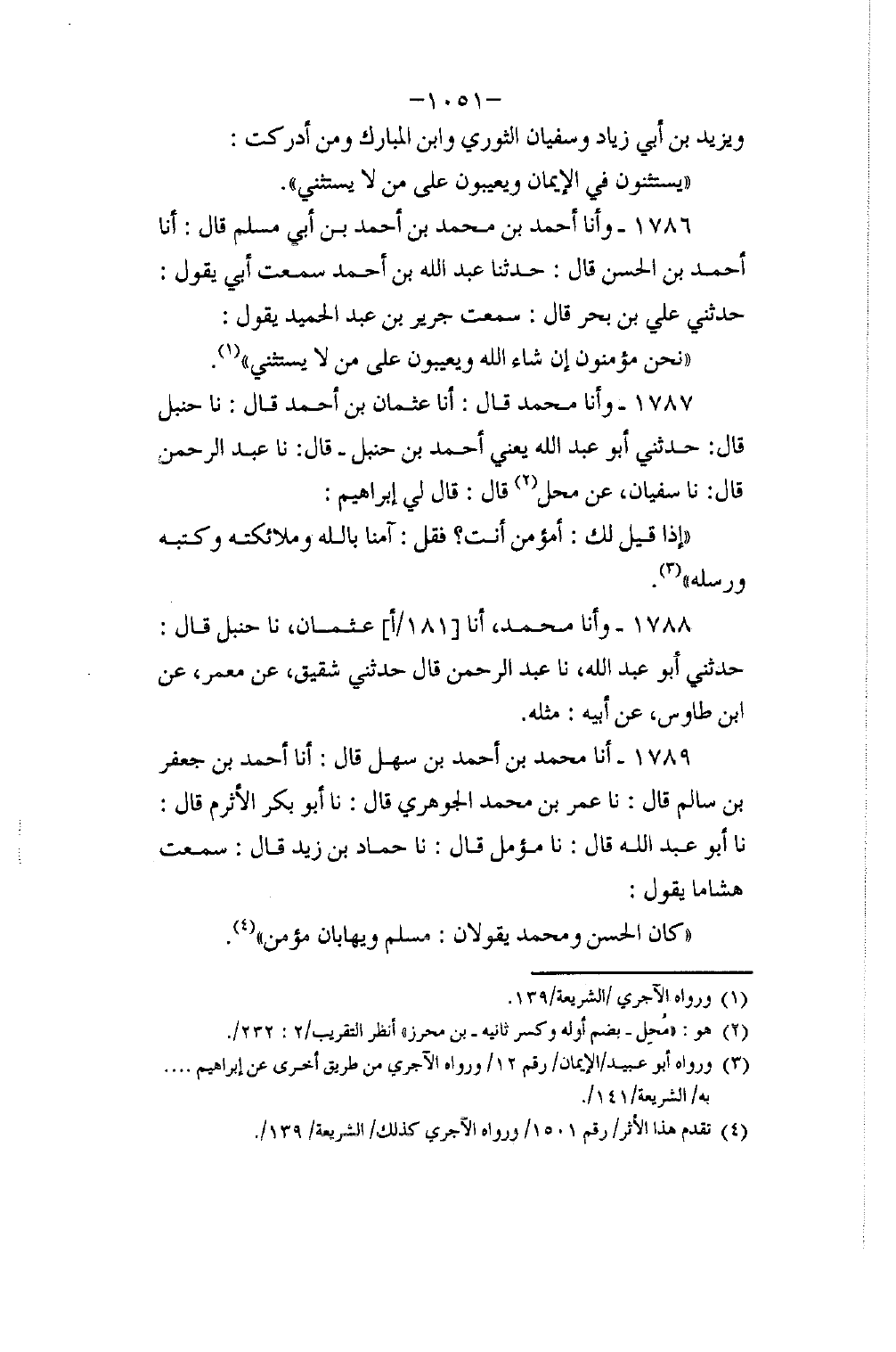 1786 - وَأَنَا أَحْمَدُ بْنُ مُحَمَّدِ بْنِ أَحْمَدَ بْنِ أَبِي مُسْلِمٍ، قَالَ: أنا أَحْمَدُ بْنُ الْحَسَنِ، قَالَ: حَدَّثَنَا عَبْدُ اللَّهِ بْنُ أَحْمَدَ، سَمِعْتُ أَبِي يَقُولُ: حَدَّثَنِي عَلِيُّ بْنُ بَحْرٍ، قَالَ: سَمِعْتُ جَرِيرَ بْنَ عَبْدِ الْحَمِيدِ، يَقُولُ: كَانَ الْأَعْمَشُ، وَإِسْمَاعِيلُ بْنُ أَبِي خَالِدٍ، وَعُمَارَةُ بْنُ الْقَعْقَاعِ، وَالْعَلَاءُ بْنُ الْمُسَيَّبِ، وَابْنُ شُبْرُمَةَ، وَسُفْيَانُ الثَّوْرِيُّ، وَحَمْزَةُ الزَّيَّاتُ يَقُولُونَ: «§نَحْنُ مُؤْمِنُونَ إِنْ شَاءَ اللَّهُ، وَيَعِيبُونَ عَلَى مَنْ لَا يَسْتَثْنِي»