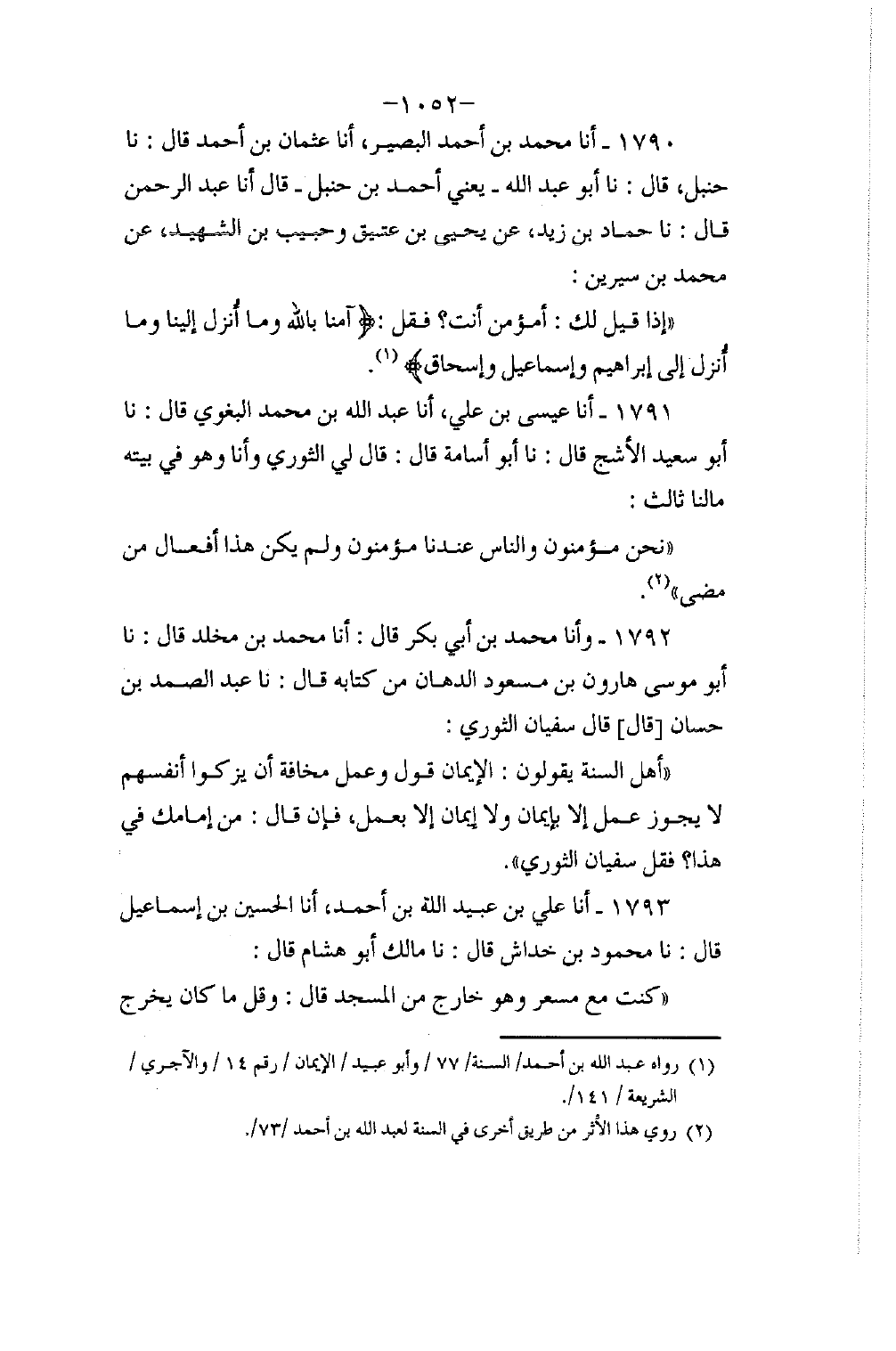 1790 - أنا مُحَمَّدُ بْنُ أَحْمَدَ الْبَصِيرُ، أنا عُثْمَانُ بْنُ أَحْمَدَ، قَالَ: نا حَنْبَلٌ، قَالَ: نا أَبُو عَبْدِ اللَّهِ، يَعْنِي أَحْمَدَ بْنَ حَنْبَلٍ، قَالَ: أنا عَبْدُ الرَّحْمَنِ، قَالَ: نا حَمَّادُ بْنُ زَيْدٍ، عَنْ يَحْيَى بْنِ عَتِيقٍ، وَحَبِيبِ بْنِ الشَّهِيدِ، عَنْ مُحَمَّدِ بْنِ سِيرِينَ: " إِذَا قِيلَ لَكَ: أَمُؤْمِنٌ أَنْتَ؟ فَقُلْ: {§آمَنَّا بِاللَّهِ وَمَا أُنْزِلَ إِلَيْنَا وَمَا أُنْزِلَ إِلَى إِبْرَاهِيمَ وَإِسْمَاعِيلَ وَإِسْحَاقَ} "