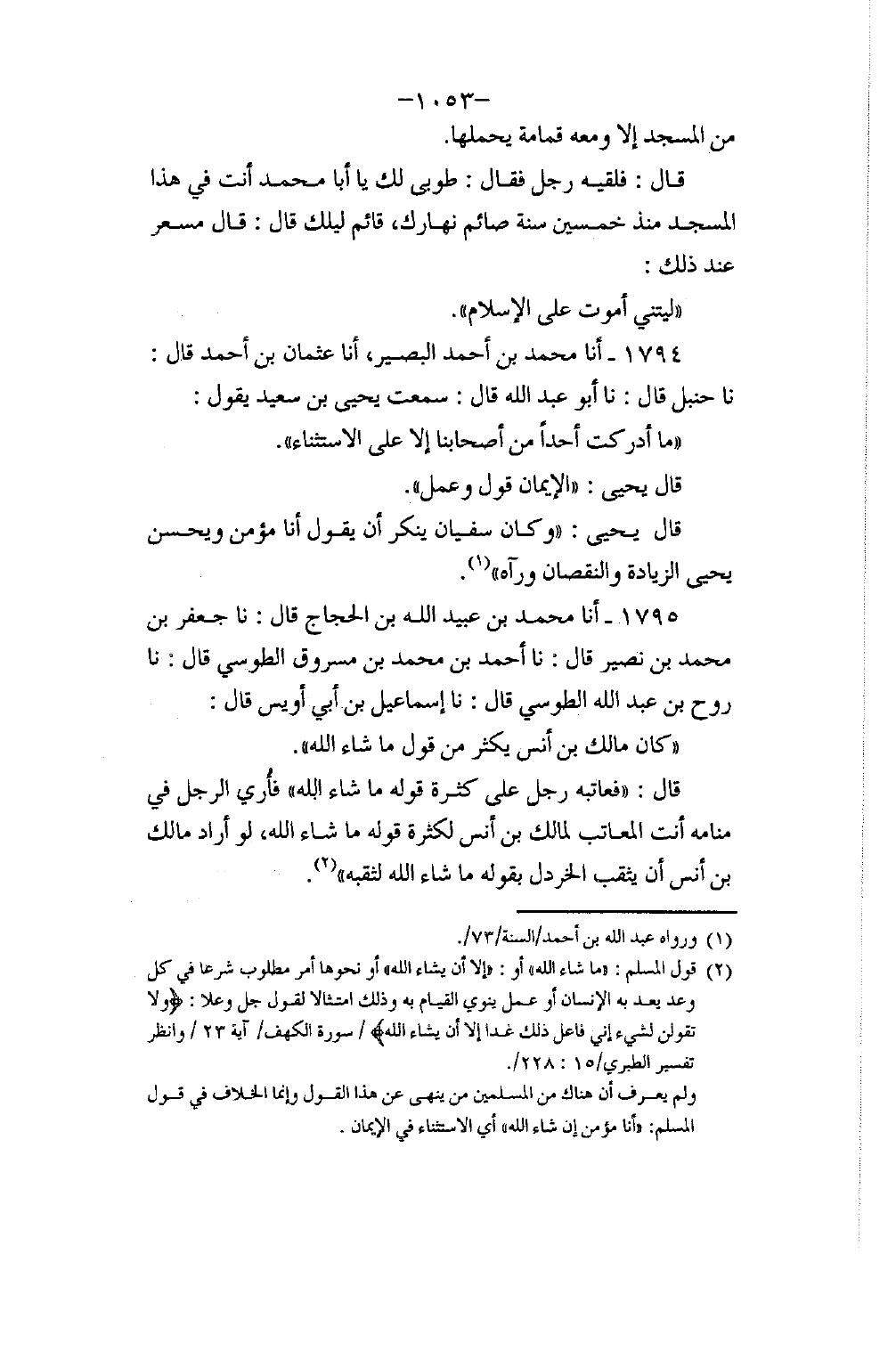 1794 - أنا مُحَمَّدُ بْنُ أَحْمَدَ الْبَصِيرُ، أنا عُثْمَانُ بْنُ أَحْمَدَ، قَالَ: نا حَنْبَلٌ، قَالَ: نا أَبُو عَبْدِ اللَّهِ، قَالَ: سَمِعْتُ يَحْيَى بْنَ سَعِيدٍ، يَقُولُ: «مَا أَدْرَكْتُ أَحَدًا مِنْ أَصْحَابِنَا إِلَّا عَلَى الِاسْتِثْنَاءِ» قَالَ يَحْيَى: «§الْإِيمَانُ قَوْلٌ وَعَمَلٌ» ، قَالَ يَحْيَى: " وَكَانَ سُفْيَانُ يُنْكِرُ أَنْ يَقُولَ: أَنَا مُؤْمِنٌ " وَيُحَسِّنُ يَحْيَى الزِّيَادَةَ وَالنُّقْصَانَ وَرَآهُ