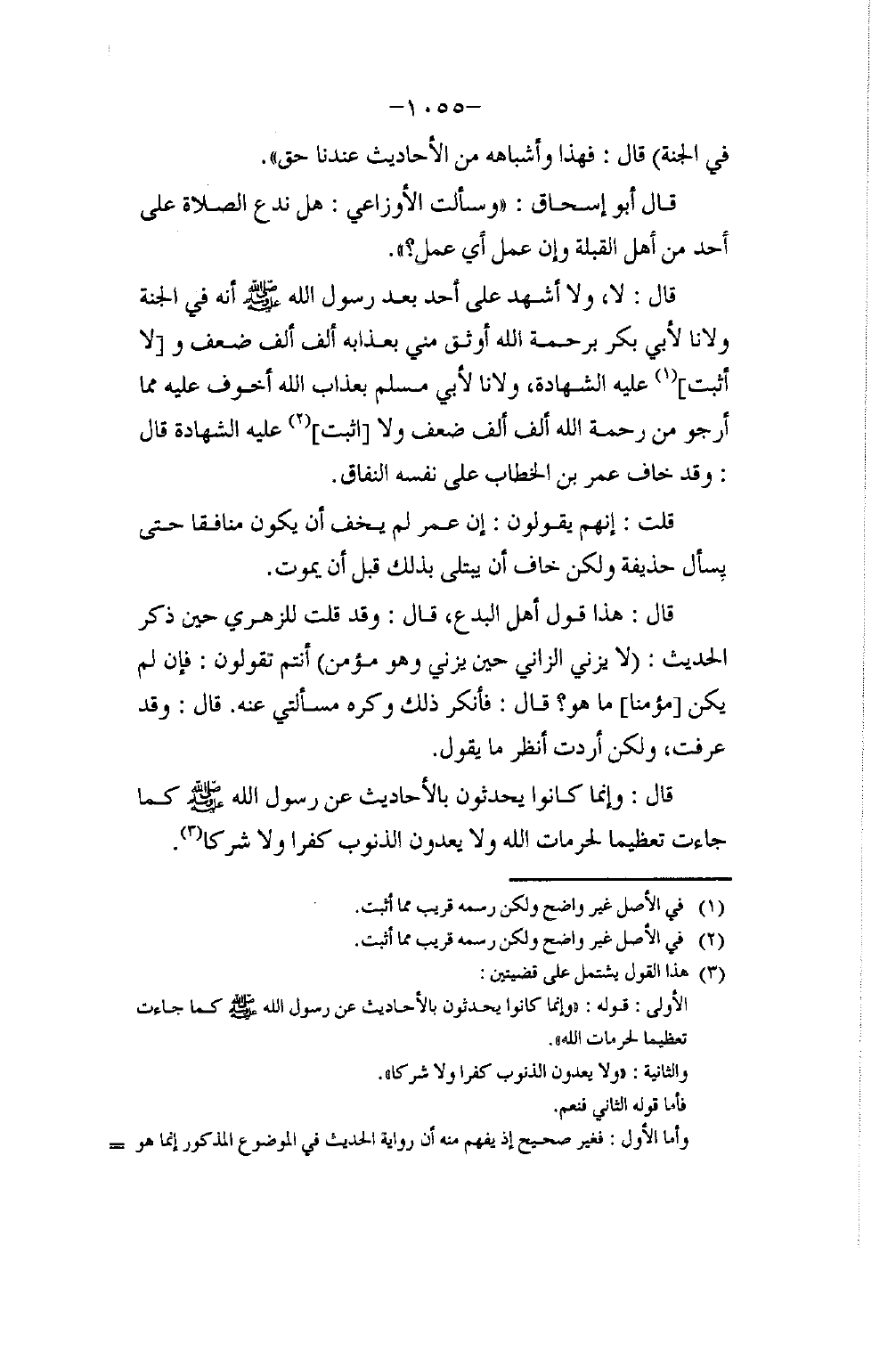 قَالَ أَبُو إِسْحَاقَ: وَسَأَلْتُ الْأَوْزَاعِيَّ: " §هَلْ نَدَعُ الصَّلَاةَ عَلَى أَحَدٍ مِنْ أَهْلِ الْقِبْلَةِ، وَإِنْ عَمِلَ أَيَّ عَمَلٍ؟ قَالَ: لَا، قَالَ: وَلَا أَشْهَدُ عَلَى أَحَدٍ بَعْدَ رَسُولِ اللَّهِ صَلَّى اللهُ عَلَيْهِ وَسَلَّمَ أَنَّهُ فِي الْجَنَّةِ، وَلَأَنَا لِأَبِي بَكْرٍ بِرَحْمَةِ اللَّهِ أَوْثَقُ مِنِّي بِعَذَابِهِ أَلْفَ أَلْفَ ضِعْفٍ، وَلَا أُثْبِتُ عَلَيْهِ الشَّهَادَةَ، وَلَأَنَا لِأَبِي مُسْلِمٍ بِعَذَابِ اللَّهِ أَخْوَفُ عَلَيْهِ مِمَّا أَرْجُو مِنْ رَحْمَةِ اللَّهِ أَلْفَ أَلْفَ ضِعْفٍ وَلَا أُثْبِتُ عَلَيْهِ الشَّهَادَةَ، قَالَ: وَقَدْ خَافَ عُمَرُ بْنُ الْخَطَّابِ عَلَى نَفْسِهِ النِّفَاقَ، قُلْتُ: إِنَّهُمْ يَقُولُونَ: إِنَّ عُمَرَ لَمْ يَخَفْ أَنْ يَكُونَ مُنَافِقًا حَتَّى يَسْأَلَ حُذَيْفَةَ وَلَكِنْ خَافَ أَنْ يُبْتَلَى بِذَلِكَ قَبْلَ أَنْ يَمُوتَ، قَالَ: هَذَا قَوْلُ أَهْلِ الْبِدَعِ، قَالَ: وَقَدْ قُلْتُ لِلزُّهْرِيِّ حِينَ ذَكَرَ الْحَدِيثَ: «لَا يَزْنِي الزَّانِي حِينَ يَزْنِي وَهُوَ مُؤْمِنٌ» ، أَنْتُمْ تَقُولُونَ: فَإِنْ لَمْ يَكُنْ مُؤْمِنًا مَا هُوَ؟ قَالَ: فَأَنْكَرَ ذَلِكَ وَكَرِهَ مَسْأَلَتِي عَنْهُ، قَالَ: وَقَدْ عَرَفْتُ، وَلَكِنْ أَرَدْتُ أَنْظُرُ مَا يَقُولُ، قَالَ: وَإِنَّمَا كَانُوا يُحَدِّثُونَ بِالْأَحَادِيثِ عَنْ رَسُولِ اللَّهِ صَلَّى اللهُ عَلَيْهِ وَسَلَّمَ كَمَا جَاءَتْ تَعْظِيمًا لِحُرُمَاتِ اللَّهِ وَلَا يَعُدُّونَ الذُّنُوبَ كُفْرًا وَلَا شِرْكًا -[1056]-، وَكَانَ يَقُولُ: الْمُؤْمِنُ حَدِيدٌ عِنْدَ حُرُمَاتِ اللَّهِ ". وَقَالَ الْأَوْزَاعِيُّ فِي الرَّجُلِ يُسْأَلُ أَمُؤْمِنٌ أَنْتَ حَقًّا؟ قَالَ: «إِنَّ الْمَسْأَلَةَ عَمَّا يُسْأَلُ مِنْ ذَلِكَ بِدْعَةٌ، وَالشَّهَادَةُ عَلَيْهِ تَعَمُّقٌ لَمْ نُكَلَّفْهُ فِي دِينِنَا وَلَمْ يُشَرِّعْهُ نَبِيُّنَا عَلَيْهِ السَّلَامُ، لَيْسَ لِمَنْ سَأَلَ عَنْ ذَلِكَ فِيهِ إِمَامٌ إِلَّا مِثْلُهُ، الْقَوْلُ بِهِ جَدَلٌ، وَالْمُنَازَعَةُ فِيهِ حَدَثٌ، وَلَعَمْرِي مَا شَهَادَتُكَ لِنَفْسِكَ بِالَّتِي وَجَبَتْ بِتِلْكَ حَقِيقَةٌ وَإِنْ لَمْ تَكُنْ كَذَلِكَ، وَلَا تَرْكُكَ الشَّهَادَةَ لِنَفْسِكَ بِهَا بِالَّتِي تُخْرِجُكَ عَنِ الْإِيمَانِ إِنْ كُنْتَ كَذَلِكَ، وَإِنَّ الَّذِي يَسْأَلُكَ عَنْ إِيمَانِكَ لَيْسَ يَسْأَلُكَ فِي ذَلِكَ مِنْكَ، وَلَكِنْ يُرِيدُ أَنْ يُنَازِعَ اللَّهَ عِلْمَهُ فِي ذَلِكَ حَتَّى زَعَمَ أَنَّ عِلْمَ اللَّهِ وَعِلْمَهُ فِي ذَلِكَ سَوَاءٌ، فَاصْبِرْ نَفْسَكَ عَلَى السُّنَّةِ وَقِفْ حَيْثُ وَقَفَ الْقَوْمُ، وَقُلْ مَا قَالُوا، وَكُفَّ عَمَّا كَفُّوا عَنْهُ، وَاسْلُكْ سَبِيلَ سَلَفِكَ الصَّالِحِ، فَإِنَّهُ يَسَعُكَ مَا وَسِعَهُمْ، وَقَدْ كَانَ أَهْلُ الشَّامِ فِي غَفْلَةٍ مِنْ هَذِهِ الْبِدْعَةِ حَتَّى قَذَفَهَا إِلَيْهِمْ -[1057]- بَعْضُ أَهْلِ الْعِرَاقِ مِمَّنْ دَخَلَ فِي تِلْكَ الْبِدْعَةِ»