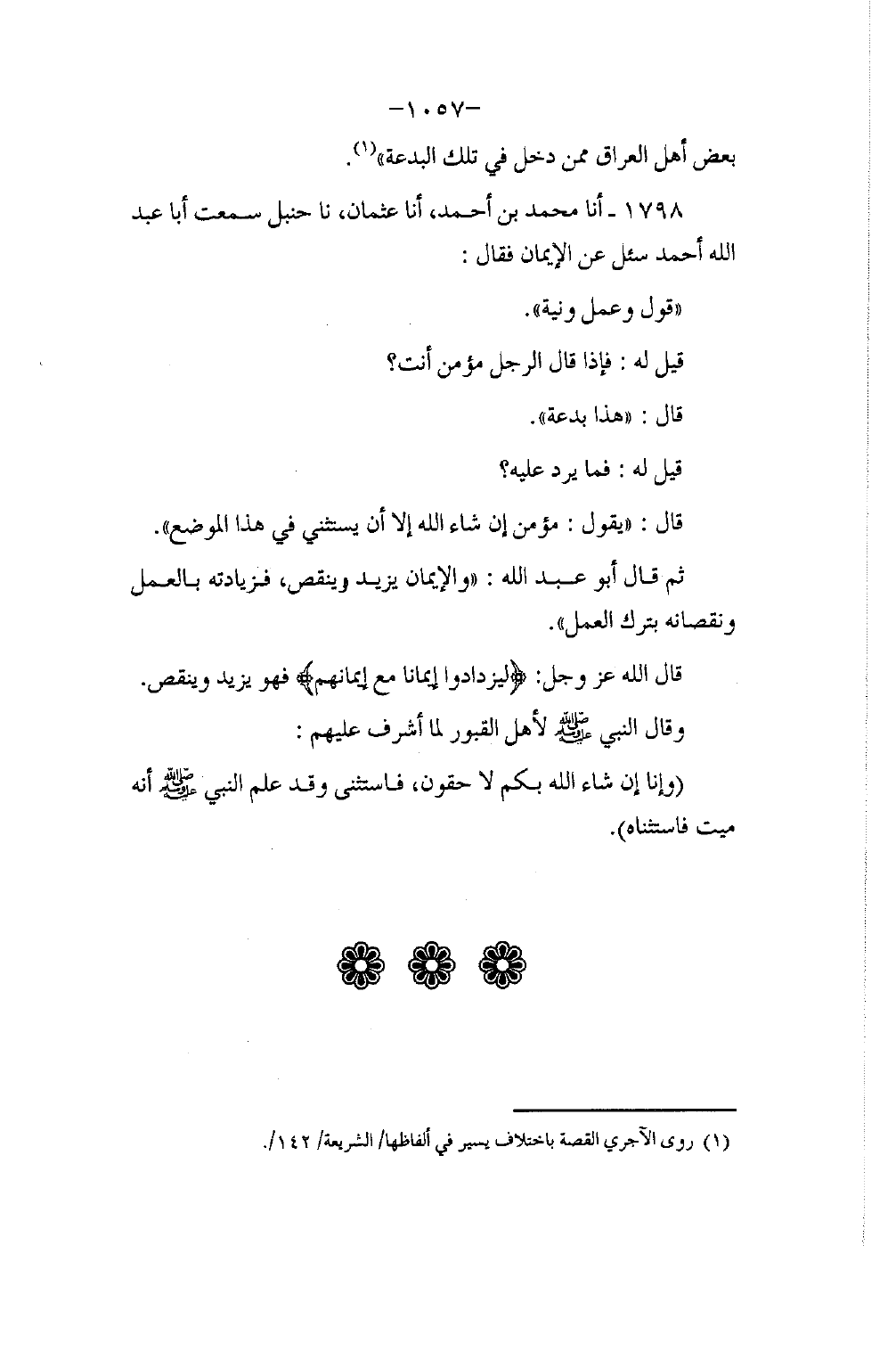 1798 - أنا مُحَمَّدُ بْنُ أَحْمَدَ، أنا عُثْمَانُ، نا حَنْبَلٌ، سَمِعْتُ أَبَا عَبْدِ اللَّهِ أَحْمَدَ سُئِلَ عَنِ الْإِيمَانِ، فَقَالَ: قَوْلٌ وَعَمَلٌ وَنِيَّةٌ، قِيلَ لَهُ: فَإِذَا قَالَ الرَّجُلُ: مُؤْمِنٌ أَنْتَ؟ قَالَ: هَذَا بِدْعَةٌ، قِيلَ لَهُ: فَمَا يَرُدُّ عَلَيْهِ؟ قَالَ: يَقُولُ: مُؤْمِنٌ إِنْ شَاءَ اللَّهُ، إِلَّا أَنْ يَسْتَثْنِيَ فِي هَذَا الْمَوْضِعِ، ثُمَّ قَالَ أَبُوعَبْدِ اللَّهِ: §وَالْإِيمَانُ يَزِيدُ وَيَنْقُصُ، فَزِيَادَتُهُ بِالْعَمَلِ، وَنُقْصَانُهُ بِتَرْكِ الْعَمَلِ، قَالَ اللَّهُ عَزَّ وَجَلَّ: {لِيَزْدَادُوا إِيمَانًا مَعَ إِيمَانِهِمْ} [الفتح: 4] فَهُوَ يَزِيدُ وَيَنْقُصُ، وَقَالَ النَّبِيُّ صَلَّى اللهُ عَلَيْهِ وَسَلَّمَ لِأَهْلِ الْقُبُورِ لَمَّا أَشْرَفَ عَلَيْهِمْ: «وَإِنَّا إِنْ شَاءَ اللَّهُ بِكُمْ لَاحِقُونَ» فَاسْتَثْنَى وَقَدْ عَلِمَ النَّبِيُّ صَلَّى اللهُ عَلَيْهِ وَسَلَّمَ أَنَّهُ مَيِّتٌ فَاسْتَثْنَاهُ