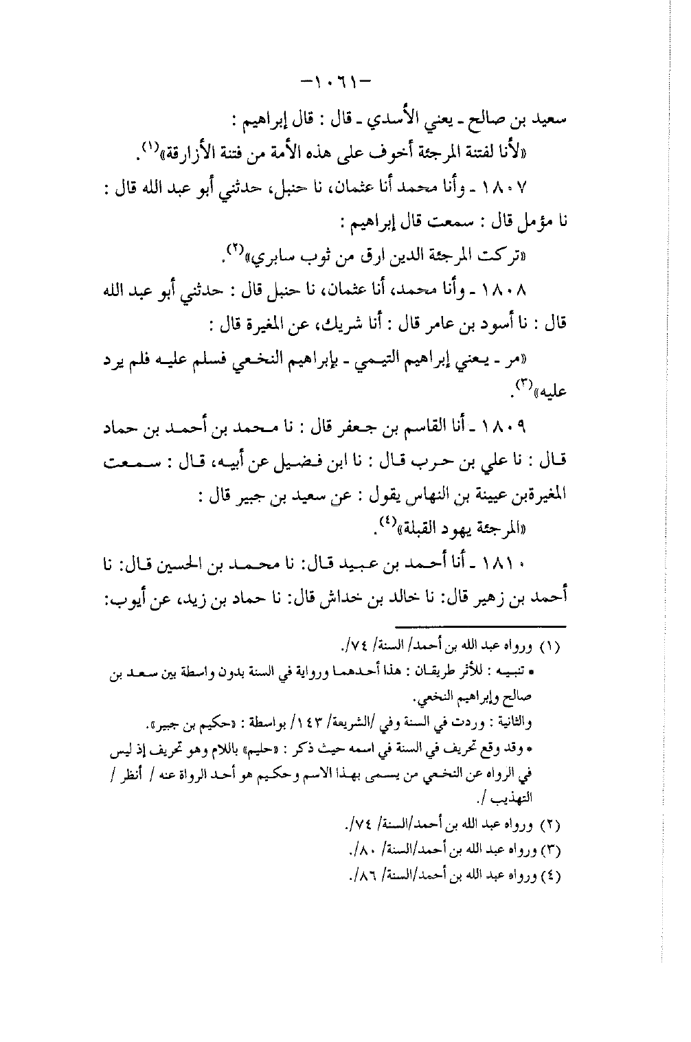 1809 - أنا الْقَاسِمُ بْنُ جَعْفَرٍ، قَالَ: نا مُحَمَّدُ بْنُ أَحْمَدَ بْنِ حَمَّادٍ، قَالَ: نا عَلِيُّ بْنُ حَرْبٍ، قَالَ: نا ابْنُ فُضَيْلٍ، عَنْ أَبِيهِ، قَالَ: سَمِعْتُ الْمُغِيرَةَ بْنَ عُتَيْبَةَ بْنِ النَّهَّاسِ، يَقُولُ: عَنْ سَعِيدِ بْنِ جُبَيْرٍ، قَالَ: §«الْمُرْجِئَةُ يَهُودُ الْقِبْلَةِ»